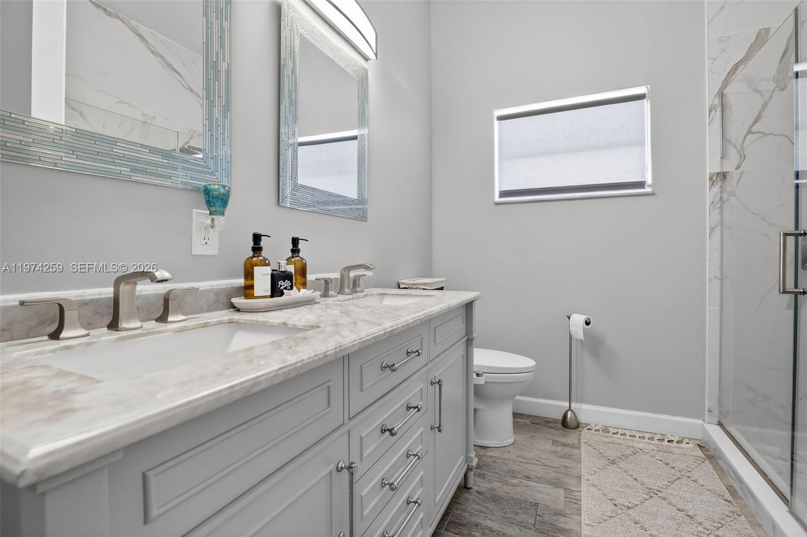 Beautiful lakefront Move-In Ready pool home in Emerald Estates! Totally updated 4-bedroom, 2-bathroom one-story home in the gated community. Fully renovated custom kitchen cabinets and new stainless steel appliances, impact doors and accordion shutters, porcelain tile, and a spacious open-concept layout with formal living, dining, and family rooms. Spacious master suite with custom walk-in closets. Enjoy 24/7 guard-gated security, a pool, a gym, & a playground. Located in an A+ rated school district & walking distance to shops and restaurants, a perfect family home in a prime location!