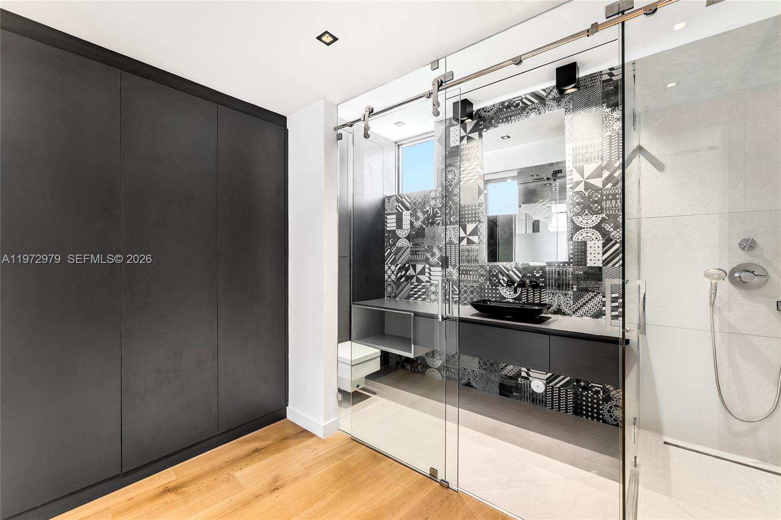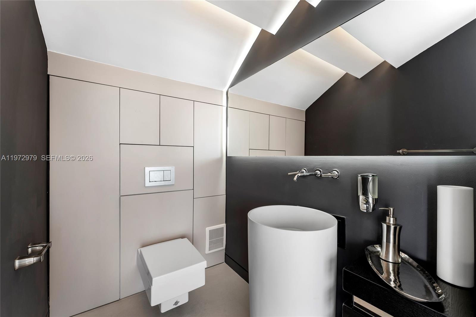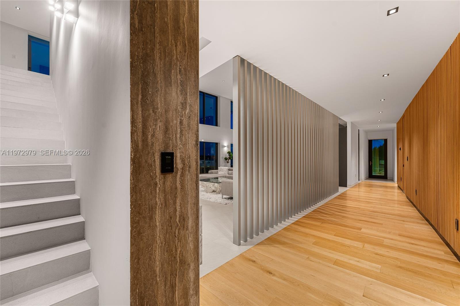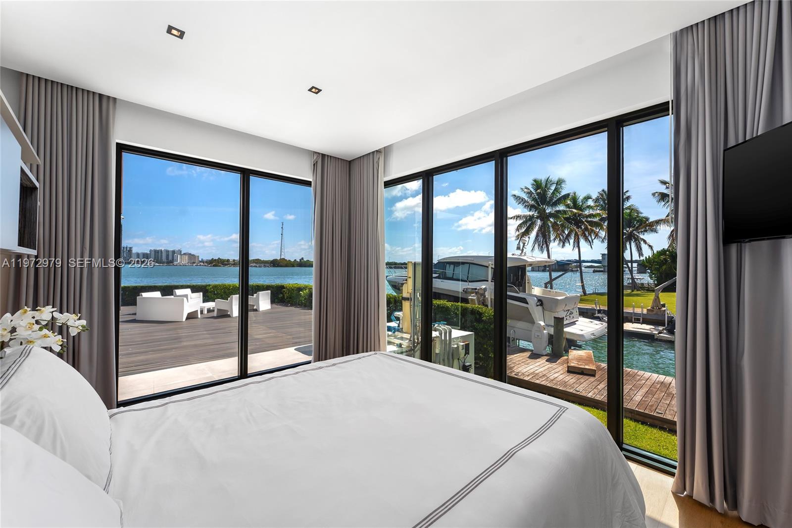 Tri-level modern bayfront estate in a quiet cul-de-sac sits on a coveted 9,650 SF point lot offering 171’ WF, 60 FT dock w/boat lift, direct bay & ocean access. Gated entry, 5BR/5.5BA incl. staff BR, 5,326 SF & dramatic Great Room w/spacious open floor plan seamlessly integrates living, entertaining, & dining areas all w/water views. Features soaring 24+ ft ceilings & enveloped by walls of glass opening to an expansive deck w/infinity pool overlooking the bay. Chef’s kitchen w/top-tier Miele appliances, integrated cabinetry & wine chillers. The 2nd floor luxe primary suite boasts a bayside terrace & stunning spa-inspired bath. Third-level rooftop lounge made to entertain with sweeping open bay & sunset views. Prime location minutes to beaches, Bal Harbour, Miami Beach, downtown & MIA.