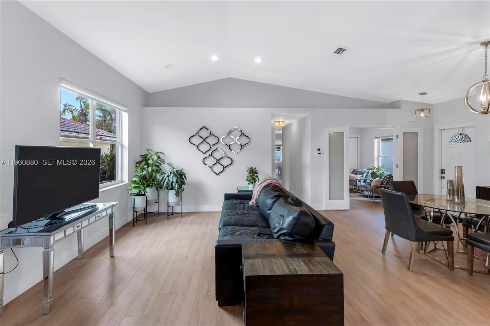 Beautiful 4-bedroom, 2-bathroom home featuring soaring vaulted ceilings and an abundance of natural light throughout. The bright, open layout seamlessly connects the spacious living room and newly updated kitchen, creating the perfect space for both everyday living and entertaining. The kitchen features stainless steel appliances, tons of cabinet space for storage, and ample counter space. Enjoy brand-new flooring throughout the home along with fresh interior paint and beautifully updated bathrooms that give the home a clean, modern feel. The generously sized bedrooms provide comfort and flexibility for family, guests, or a home office. Step outside to a nice patio area, perfect for relaxing or entertaining. Move-in ready and offering the perfect blend of space, updates, and functionality.
