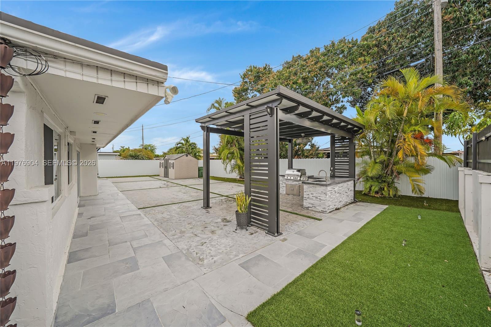 This beautiful Hialeah home is completely remodeled, with 4 bedrooms plus a den, a huge master suite with walk-in shower, and spacious built in closet, custom wall paneling, modern remodeled kitchen with stainless steel appliances, big family room, new porcelain floors throughout, freshly painted, washer and dryer, surveillance system, impact doors and windows, gated circular driveway. The fenced backyard is very large, with room for a pool, full bathroom outdoors, a covered pergola and built-in outdoor kitchen, lighting and a large double shed. This is a beautiful home for entertainment, ready to move in, very central, in a great neighborhood, close to main expressways, restaurants and shopping centers. So many updates to list, and very well taken care of. A true must see!