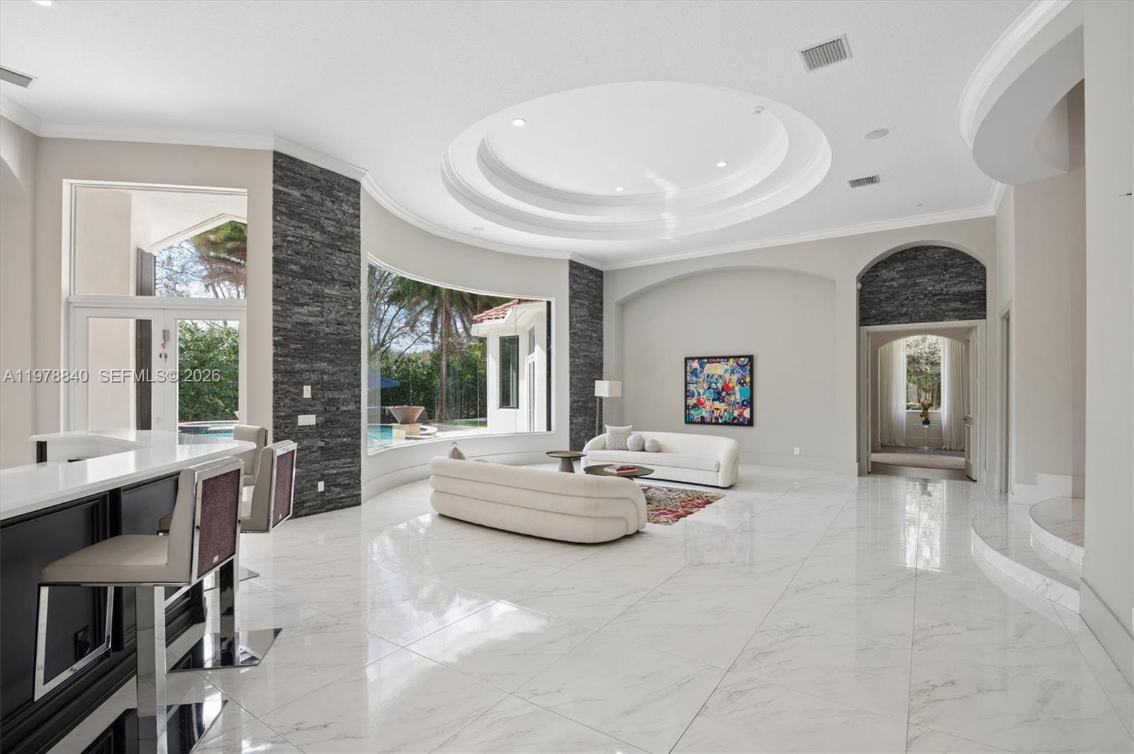 Located in the prestigious enclave of Grand Oak Estates, this residence offers luxurious spaces, architectural distinction, and modern comfort. Enter through elegant iron gates to discover one of only 32 homes in this exclusive community. The residence spans nearly 6,000 square feet and was originally built in 2007, with an interior refurbish completed in 2016 featuring bespoke Italian design elements. The result is an elegant living environment that blends timeless elements with contemporary style. The features a great movie room and showcases a gourmet kitchen appointed with premium Viking appliances. Additional features include a private executive office, hurricane-impact windows and doors, a dedicated home theater, and advanced water systems including softening and reverse osmosis filtration. Outdoor living is ready for relaxation and entertaining, highlighted by a vanishing-edge heated saltwater pool and an expansive patio area with lush trees. A fully equipped summer kitchen, beer tap system, outdoor television, and integrated sound system create a true resort-style experience for everyday living.