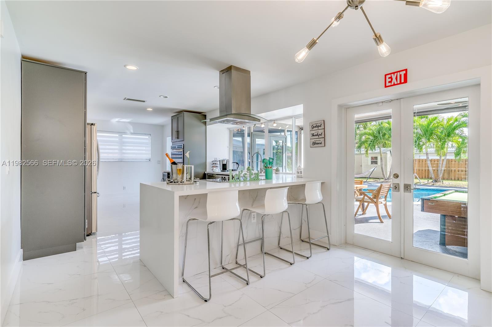 Beautifully renovated 3-bedroom, 2-bathroom pool home in Hollywood Hills situated on a spacious 10,000+ sq ft lot. This bright and modern home features an open layout with elegant porcelain floors, updated kitchen and bathrooms, and abundant natural light throughout. The backyard is a private tropical retreat with a heated pool, hot tub, covered patio, outdoor dining area, and lush palm trees, perfect for entertaining or relaxing. Additional features include CBS construction, hurricane shutters, central A/C, and a large driveway. Conveniently located near parks, shopping, dining, major highways, and just minutes from the beach. A perfect blend of comfort, style, and South Florida lifestyle.