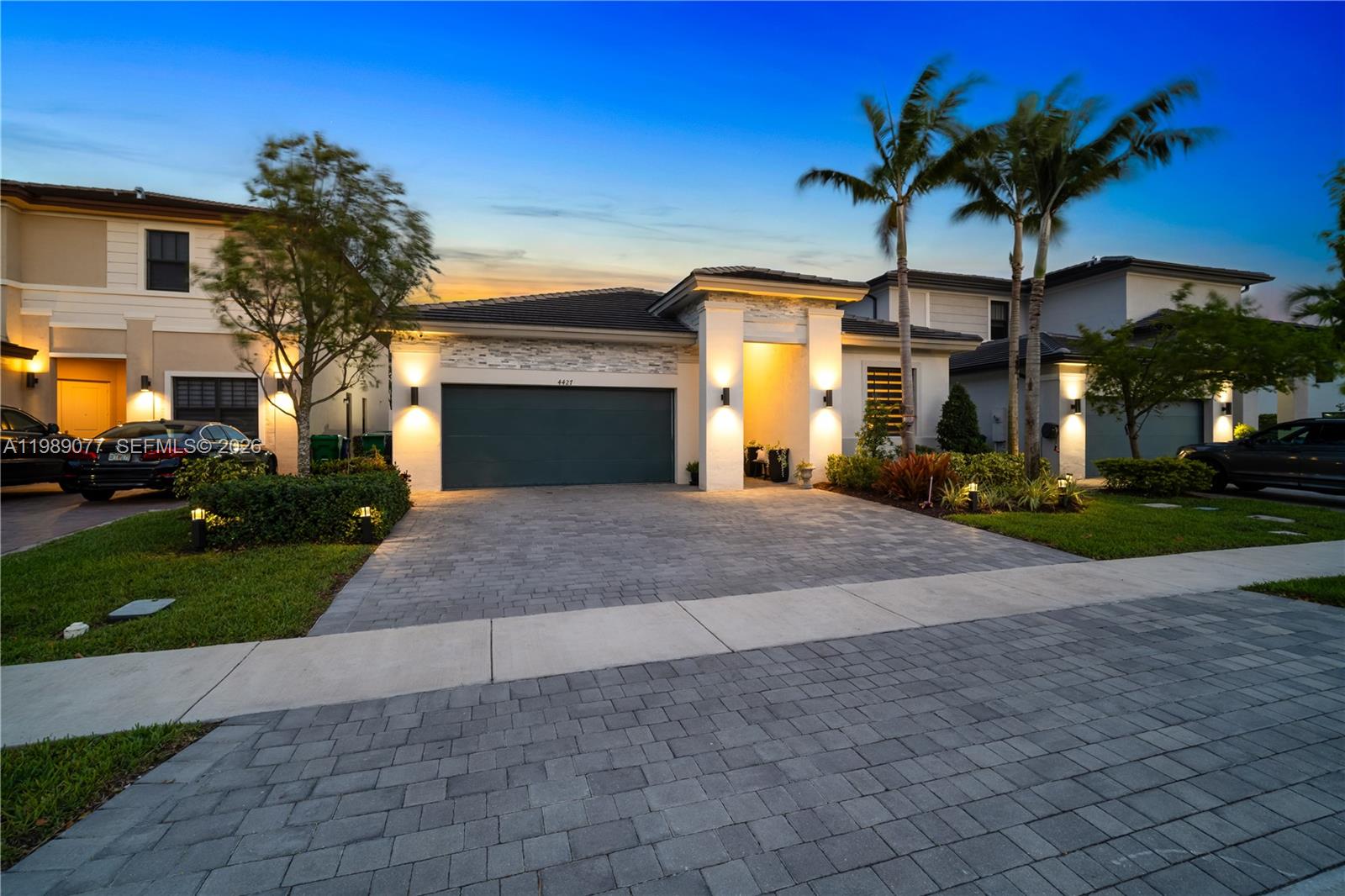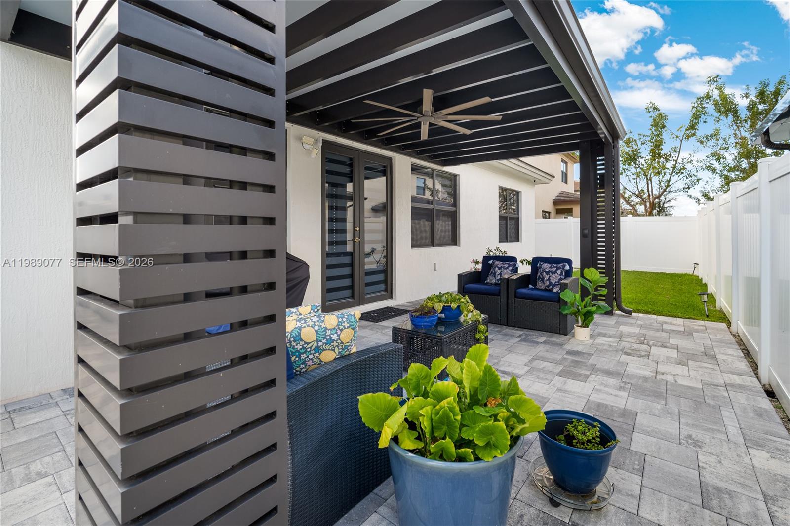 Experience modern luxury in this stunning 4-bedroom, 3-bathroom single-story residence, where high ceilings and designer window treatments create an airy, sophisticated ambiance. The open-concept living space is anchored by a striking decorative wall and a family room featuring a custom built-in entertainment unit and ceiling-mounted surround sound. The chef-inspired kitchen boasts an upgraded oversized island and a walk-in pantry with ample storage. Retreat to the primary suite to find a meticulously crafted custom closet. Outdoor living is redefined in the private backyard, fully enclosed by a PVC fence with dual side gates and featuring extensive premium pavers wrapping the home and extending to an oversized driveway. Entertain under the custom pergola, equipped with integrated lighting and a cooling fan. Modern essentials include a security camera system with a dedicated monitor and overhead garage storage racks. Residents enjoy resort-style amenities including a clubhouse, fitness center, pool, and playground. With its prime location near Memorial Hospital and easy access to I-75 and the FL Turnpike, this home offers the perfect balance of luxury and convenience. This turn-key property is ready for its most discerning buyers.