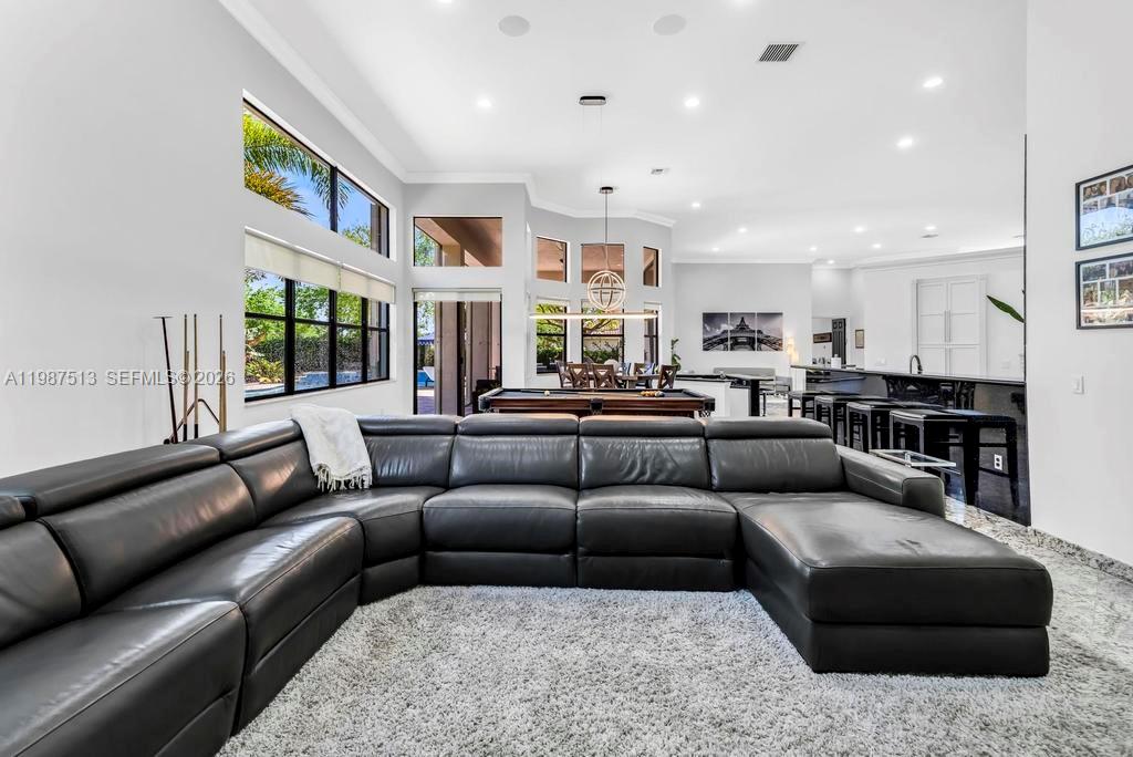 Stunning lakefront home located in the exclusive guard-gated community of Riverstone in West Davie. This spacious residence features six bedrooms and five full bathrooms, including three en-suite bedrooms. Grand living space with volume ceilings and a formal dining room, creating an open and impressive layout. Designed for entertaining, the home features a step-down wet bar with beverage cooler, over 4,200 square feet of custom granite flooring, and 8-foot high interior and exterior doors throughout. The primary suite includes dual vanities, a soaking tub, and an oversized custom marble walk-through shower. The home is equipped with a tankless water heater, three central AC units, and hurricane-impact doors, providing full hurricane protection. Designed for entertaining both inside and out, the outdoor space features a summer kitchen, tropical landscaping, and a resort-style pool area. The patio is fully enclosed with hurricane shutters, and a cabana bath provides direct access to the pool. The pool was remodeled in 2020 and includes a saltwater system, new heater and pumps, and full automation controlled via app. Tall privacy hedges surround the large one-plus-acre corner lot. Community amenities include a guard-gated entry, pickleball courts, basketball courts, pavilion, and playground. Riverstone is conveniently located near Vista View Park, highways, shopping, dining, airport, and hospital. Move-in ready and meticulously maintained.