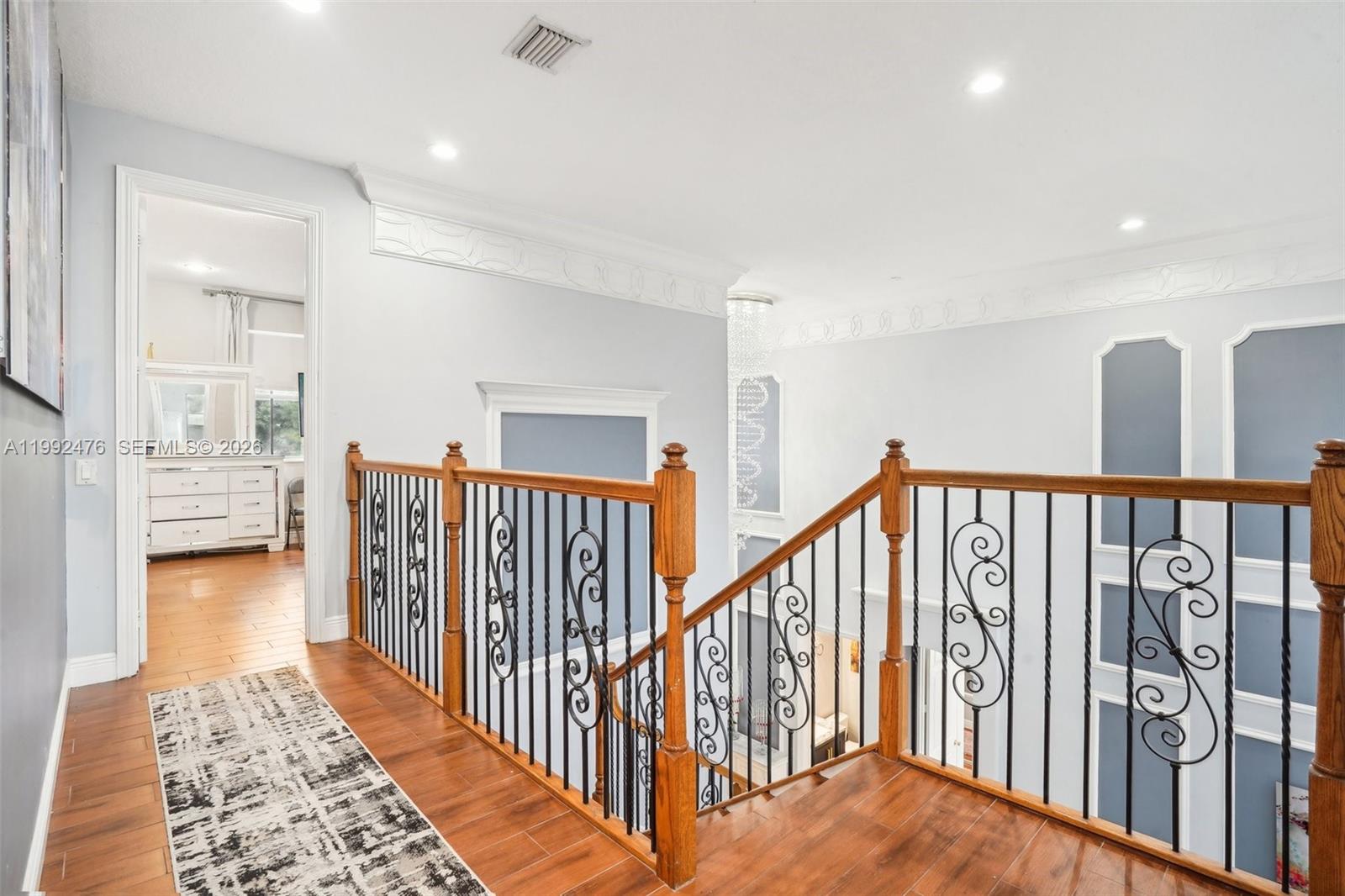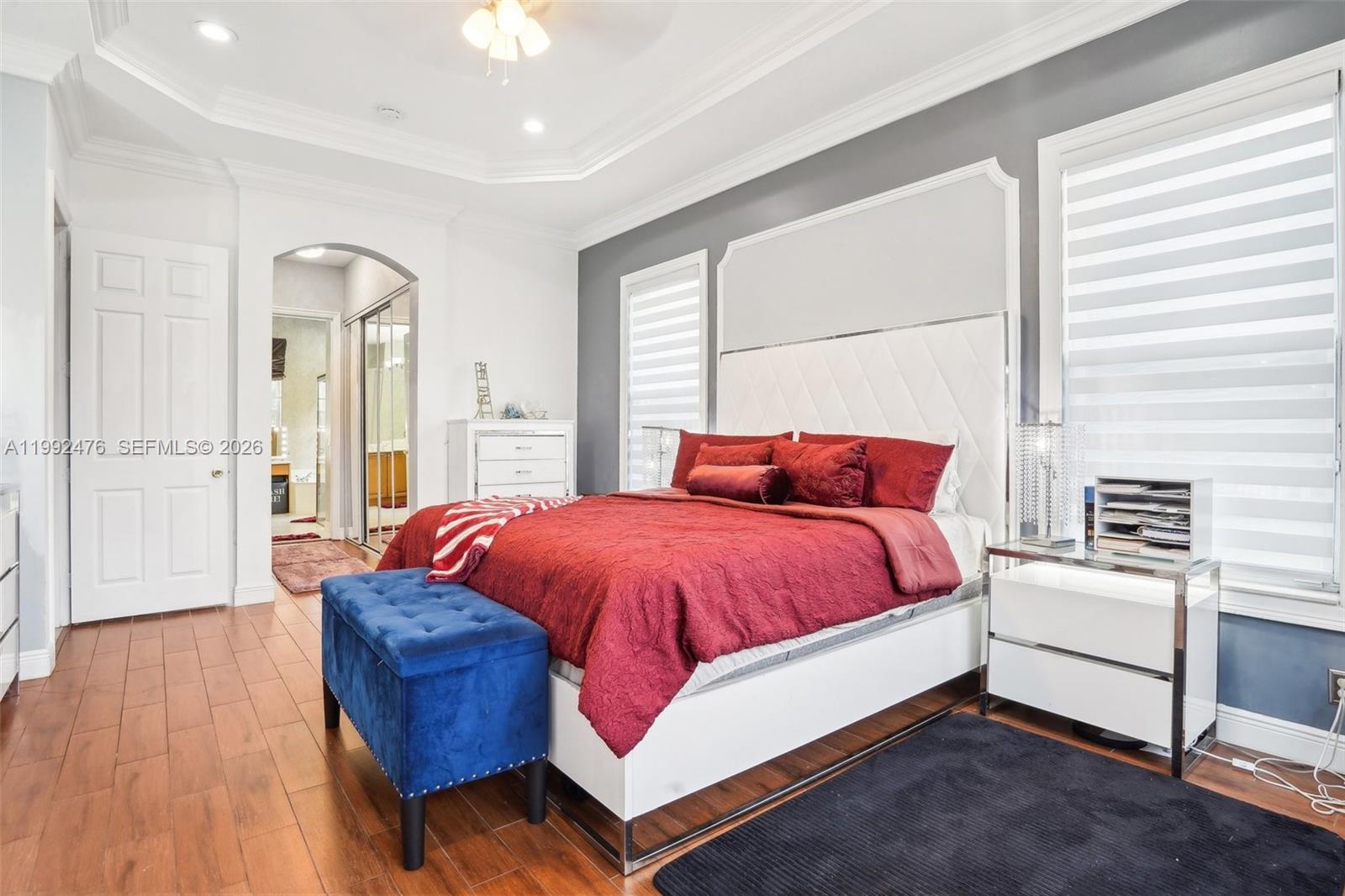 Experience luxury waterfront living in this exceptional two-story residence located in the highly sought after Biltmore Estates. Originally designed as a model home by Lowell Homes, this impressive 4-bedroom, 3.5-bath property showcases elegance and thoughtful design throughout. The spacious open floor plan is enhanced by soaring ceilings, crown molding, custom built-ins, a stylish wet bar, and a formal banquet area perfect for entertaining. The property features formal living and dining areas in addition to a huge family room and office. The expansive eat-in kitchen offers ample space for cooking and gathering, with custom cabinetry, gold granite countertops & new high end appliances. The Large first-floor primary suite provides a private retreat with dual vanities, a soaking tub, and a separate walk-in shower. Upstairs, a second primary suite features its own balcony, In addition there are another 2 large bedrooms adding flexibility and comfort for guests or extended family. Situated on an oversized cul-de-sac lot, the home offers breathtaking lake views from the backyard, creating a serene outdoor setting. Additional highlights include a two-car garage, separate laundry room and low HOA fees. Residents enjoy access to resort-style amenities such as a pool, tennis courts, fitness center, and playground. Conveniently located near top-rated schools, shopping, dining, and major highways, this home perfectly combines luxury, comfort and convenience in a Top gated Community.