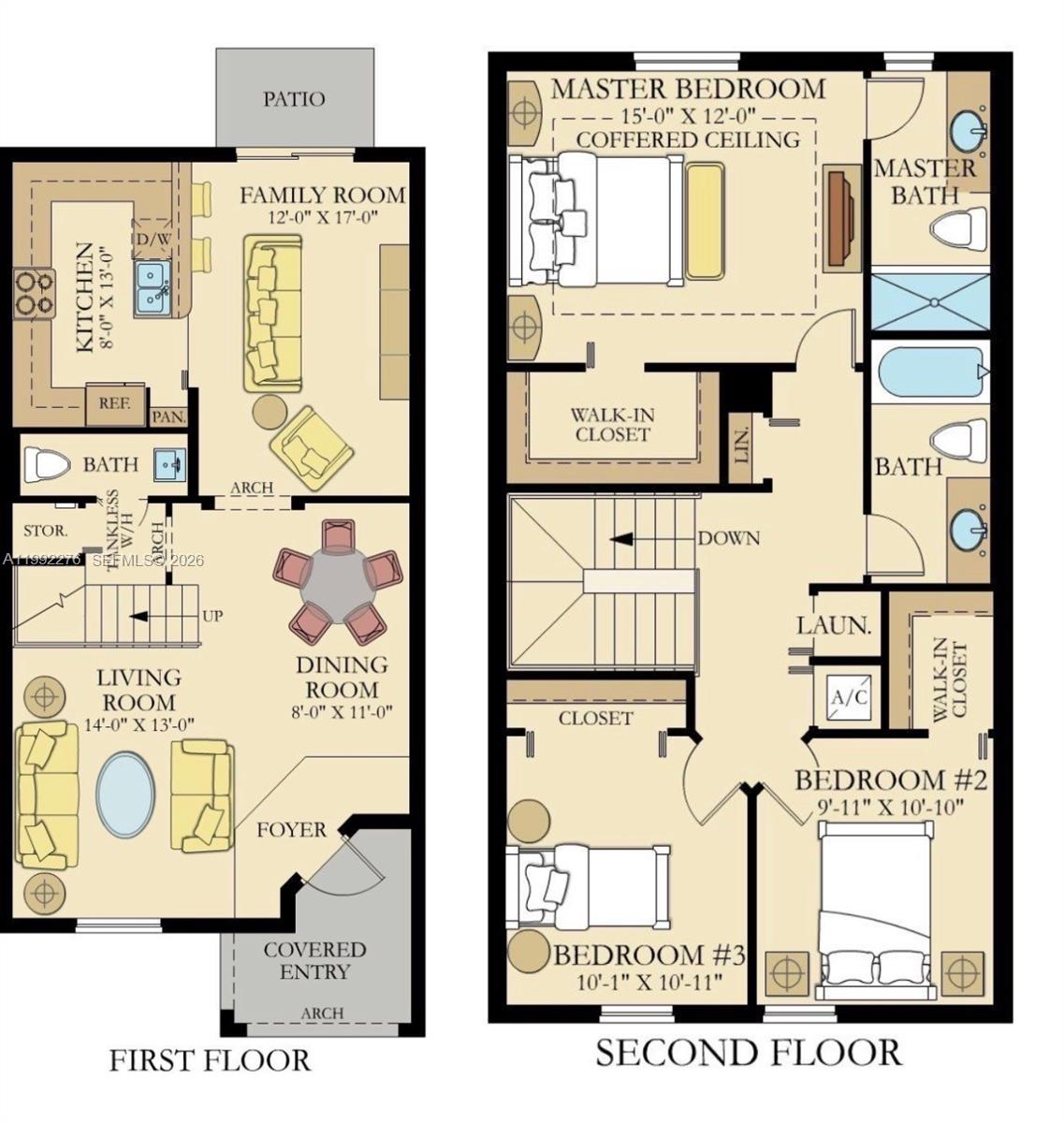 Step into DESIGNER-UPGRADED living in one of Aquabella’s most striking townhomes currently available, where every finish and detail was thoughtfully picked! This elegantly remodeled 3-bed, 2.5-bath townhome is truly move-in ready, featuring fresh interior paint, hurricane impact doors, modern wood flooring throughout with no carpet, a custom modern stair railing, recessed lighting, zebra blinds, and an upgraded first-floor powder room. A stunning built-in fireplace wall unit welcomes you and sets the tone for the warm, open-concept living space. The living and dining area flows into a stunning kitchen with high-end two-tone cabinetry and upgraded Frigidaire Gallery appliances, plus an additional family room. West-facing exposure fills the home with natural light throughout the day! Enjoy a private oversized patio finished with artificial turf. The generously sized primary suite offers a comfortable retreat, while both the primary and second bedrooms feature large walk-in closets. Plus all three rooms are fit with custom built-ins closets. Additional features include: water filtration system, washer/dryer, Ring door camera/alarm system, and AT&T internet is included with the HOA. Two assigned parking spaces plus guest parking conveniently located across the home. Resort-style amenities include two clubhouses, pools, gyms, splash zone, parks, gated entrances and year-round community events. This is a fee simple townhome with flexible financing options including 3.5% or 5% down.