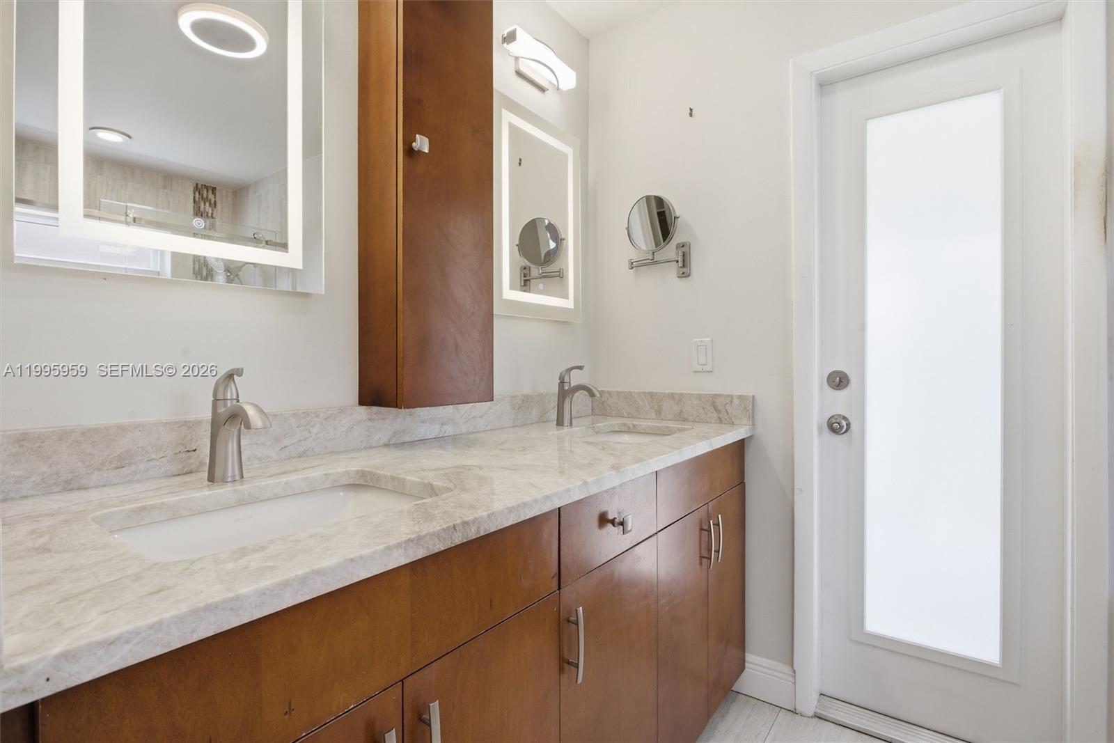 An outstanding 3 bed 2 bath north facing lake property, with beautiful upgrades, big back yard and large lake deck! As you enter this unit from a palm lined street and face its semi-circular driveway with plenty of foliage, the excitement builds. You can’t help but notice the stunning grey wood-like tiles throughout the living areas and the elegant wine bar to your right. A formal dining section with a great view of the lake is right there. Next is the spectacular remodeled kitchen with white cabinets, Frigidaire appliances and black & white mottled countertops. The family room boasts built in cabinetry and a TV above a fitted wall unit with quartz top! Both bathrooms are completely remodeled with lovely fixtures, soft close cabinets, wall tiles, solid countertops and captivating details. Your master is a wonderful, well-lit haven with double customized closets, double basins, a glass enclosed shower and lovely solid counters. The bedrooms have engineered wood floors, and the home has nice ceiling fans/lighting in every room. It’s completed with impact windows, a caged porch at back, large back yard with space for a pool plus huge deck for enjoying the lakeside. This close nit community is in Davie where everything is nearby. This home is a gem for anyone who wants a move in ready lakeside residence. There is no HOA and only a $250 annual fee for lake maintenance.