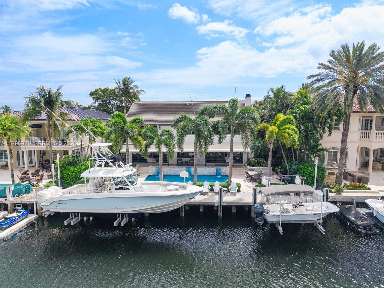 Rare opportunity to own a beautifully renovated deepwater estate home on prestigious Lake Placid in Lighthouse Point. The residence offers 80' of water frontage & direct 7 minute ocean access w/no fixed bridges, a true boater’s dream. Spanning 4,100+SF under air, this exceptional 5-bedroom (2 primary suites) + office, 5.5-bath pool home blends elegance & comfort with tumbled travertine flooring, an open family room with real fireplace & built-ins, a designer chef’s kitchen featuring quartz countertops, island seating, beverage refrigerator, ice maker, & extensive custom cabinetry. Cable railing staircase opens to loft area. Expansive 2nd fl primary suite is a private retreat with dual en-suite bathrooms, spa tub, walk-in closets, flex office/den & a balcony overlooking the waterway. Multiple additional bedrooms offer en-suite baths and flexible living options, including a junior suite with direct patio access. Enjoy South Florida living at its finest with a resort-style backyard featuring a saltwater pool with waterfall, covered patio, lush tropical landscaping, and outdoor shower. The new concrete dock is equipped with batter piles, two boat lifts (27,000lb & 7,000lb), 60-amp service, and is perfectly positioned for ultra-quick boating access—only 7 minutes to the ocean. Additional features include impact windows and doors, newer roof (2020), 2 AC systems, 2 tankless water heaters, surveillance & security system, epoxy garage floors & circular driveway for 8+ cars.