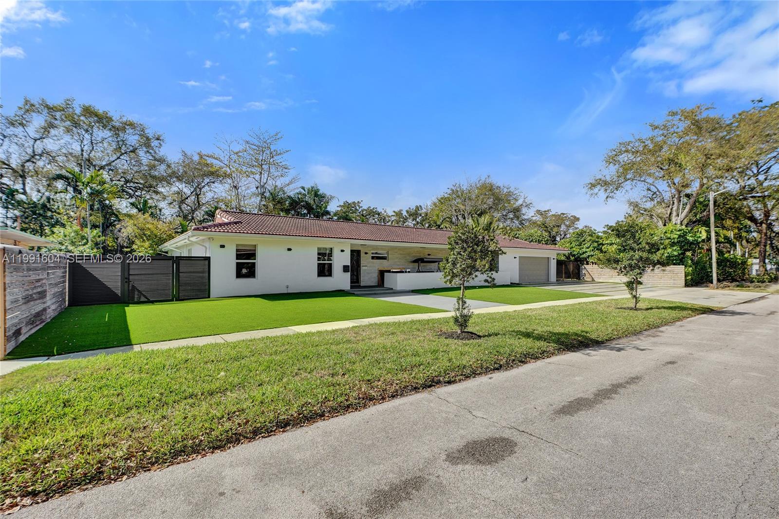 Welcome to this beautifully maintained modern one story home in the sought after Skylake neighborhood of North Miami Beach. Located on a semi private street and set on a lot of up to 13000 sq ft, this property offers privacy, comfort, and style. The home features 4 bedrooms and 3 bathrooms, including a spacious primary suite with a sitting area, dual sinks, and a sleek shower. A split bedroom layout provides flexibility and privacy. The layout includes a formal dining area, a family and dining combination, and a counter that connects the kitchen and living areas. The kitchen features a Taj Mahal marble countertop and essential appliances including a wall oven, electric range, microwave, dishwasher, and disposal. Porcelain flooring runs throughout, and impact windows provide security and efficiency. The home also includes a security camera system. Enjoy the backyard with a mosaic tiled pool featuring a saltwater system and heater, open porch, outdoor kitchen, artificial turf, and plenty of space for entertaining. Additional features include a 2 car garage, driveway parking, laundry area, and central air and heating. Do not miss this opportunity in North Miami Beach.