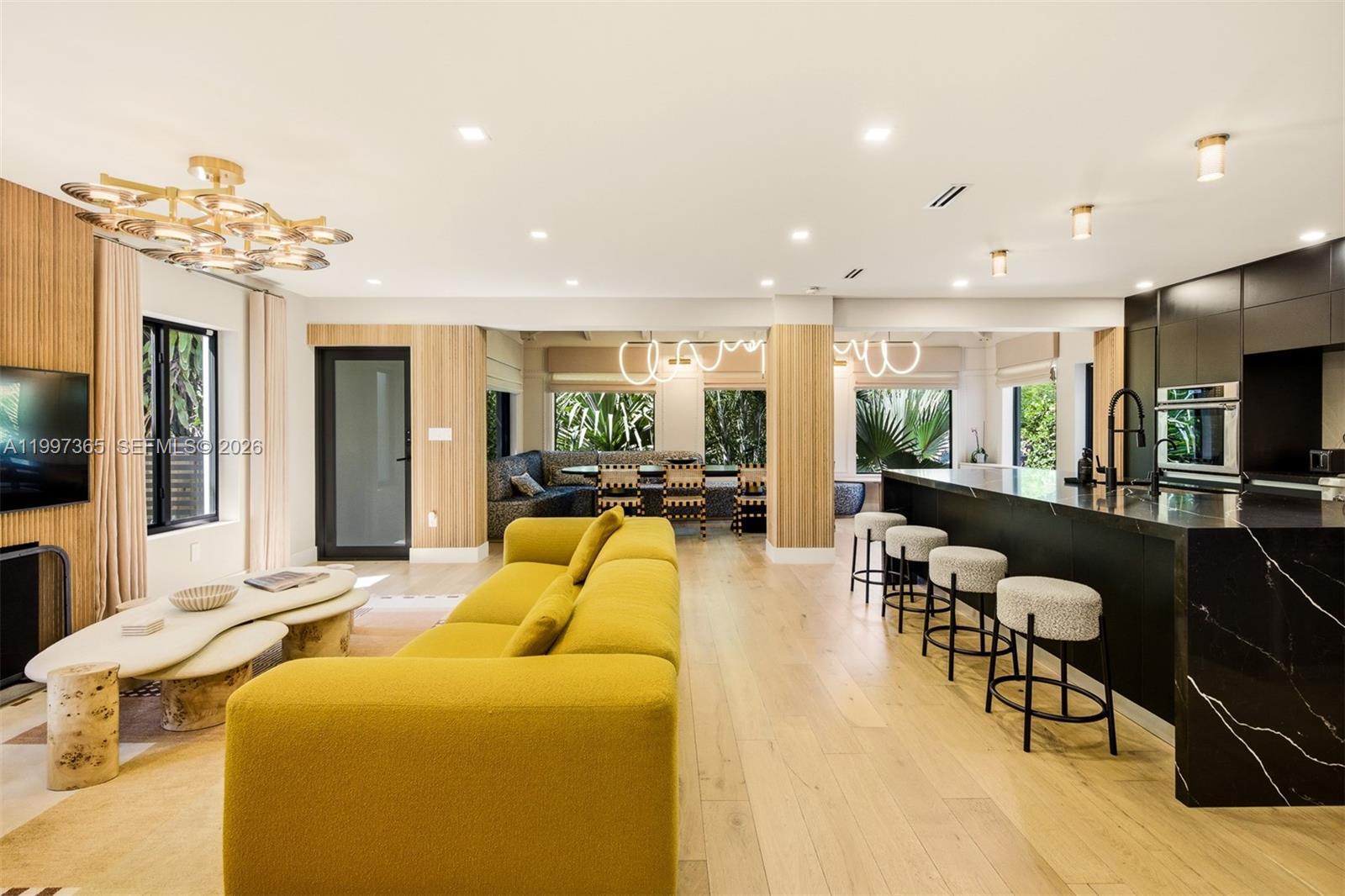 A masterfully reimagined Spanish Mediterranean compound where timeless architecture meets bespoke modern design.Set within a private, lushly landscaped setting, this residence offers nearly 3,000 SF of refined living space, including a 4-bedroom, 3-bath main home and a detached two-story guest house.The first level has been thoughtfully redesigned by Miami-based Moniomi designers, featuring custom millwork, curated finishes, and light-filled open living spaces. A built-in dining banquette and elegantly composed interiors flow into a chef’s kitchen centered around an oversized island and outfitted with professional-grade Thermador appliances.Upstairs, private quarters continue the elevated design with refined finishes and premium fixtures, including Toto toilets.Offered fully furnished with high-end designer pieces, the home delivers a seamless turnkey experience.The detached guest house includes its own kitchen, living area, full bath, and private upstairs bedroom—ideal for guests, a home office, or income-producing use.Outdoors, mature tropical landscaping surrounds a sleek pool and spa, with fully gated grounds creating a private, resort-like setting.A rare opportunity to own a design-forward, fully furnished compound defined by craftsmanship, privacy, and versatility.