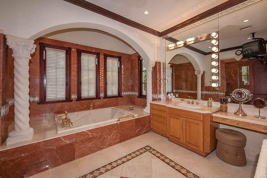 Stunning 5 BR/6.5 bath Mediterranean estate features 2 dens, large office, ample closets & balconies throughout. Greeted by a private courtyard & a 3 tier Italian fountain, this magnificent home has imported Honduras Mahogany doors, tiles handcrafted 1 by 1 in Colombia, Rojo Alicante marble floors & Comino Crespo wood detailed cabinets & furniture, gourmet custom Poggenpohl kitchen, eat in breakfast area, spacious wet bar w/custom wood finishes, pool, spa, cabana, dock, summer kitchen & 76' on the water.