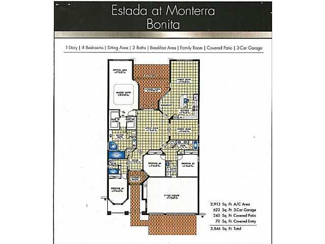 Private guard gated community, Estada at Monterra. Bonita model 4/3 with volume ceilings, 3 car garage. LARGEST 1 STORY FOR SALE. Impact windows,fenced in backyard with lush landscaping, 2 Zone A/C units. BEST LOCATION. Built in 2011. "A" RATED COOPER CIT Y SCHOOLS.
