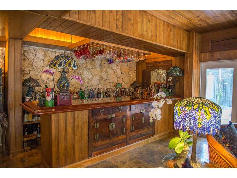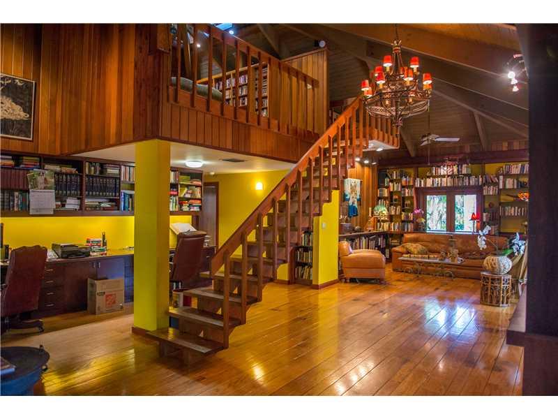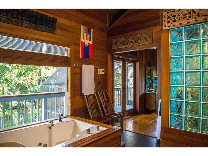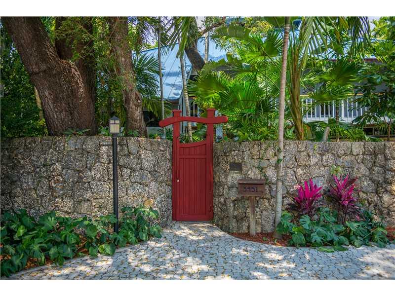 Architecturally distinctive home in prestigious guard gated Four Way Lodge Estates. Expansive living spaces overlooking tropical pool surrounded by coral rock wall for the utmost in privacy. Potential to easily reconvert to 3BR/3BA. Features include wood beamed ceilings, custom built-ins and cook's kitchen w/island & gas range. French doors open from all rooms to wrap-around porch which surrounds the homes upper level. Situated high on a coral ridge & not in a flood zone. Walk to the Grove village center.