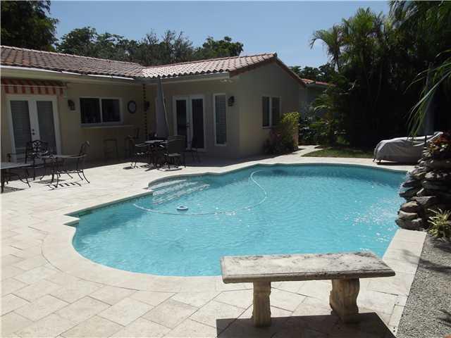 Spectacular 1 story home with beautiful pool! Sparkling pool views from almost every room. Spacious layout 3 bedrooms, 3 bathrooms, Family room, Great kitchen with great breakfast area, Wonderful lighting throughout interior and exterior of home, Window treatments - Hunter Douglas and wooden blinds throughout, French doors, Saltillo Flooring throughout, Great curb appeal, One of the best locations in the Platinum Triangle of Coral Gables!