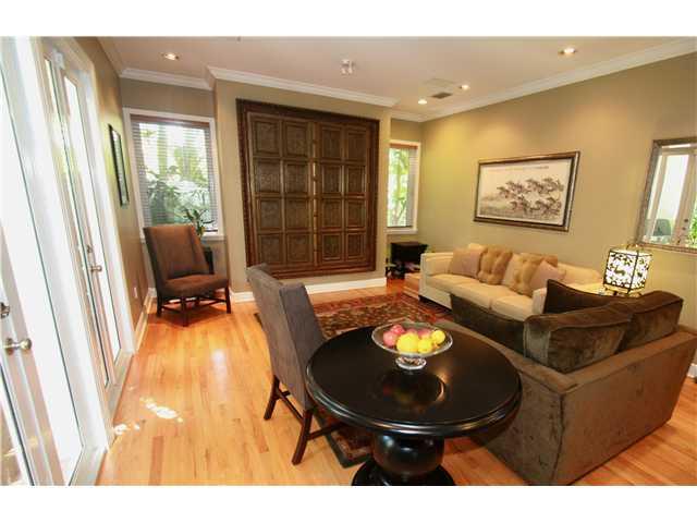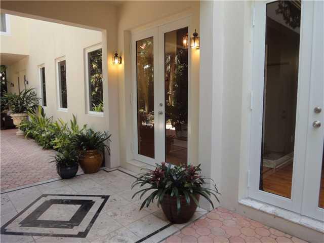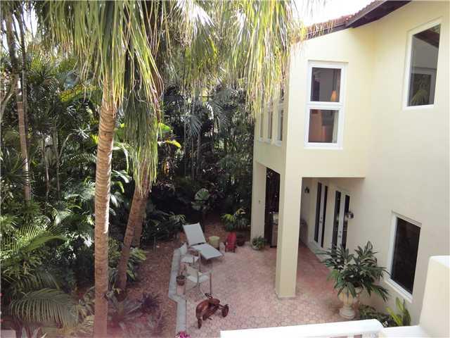 Two-story contemporary on 5000' lot with walled-in,tree-covered brick courtyard.Low maintenance/lots of entertaining areas.LR,DR, Kit/Fam rm.1/2 bath down.Upstairs is 3/2. Custom crown moldings,high ceilings, great indoor/outdoor flow with new impact wind ows and ten foot doors that allow lots of light. Covered porch leading from second floor to a rooftop terrace over the garage. Outside stairs lead to a garden. Alarm system, gate camera, and programmble timers for lighting. Fabulous. A private oasis.