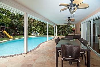 Location! Walking distance to Palmetto Elem, Middle & Senior High Schools. Move into Pinecrest in this wonderful 4 bdrm, 2.5 bath family home on beautiful corner 15,000 SF lot. 2004 renovations include gourmet eat-in kitchen w/large center island, wood fl ring, 2005 shingle roof, A/C, partial plumbing & elec, home hurricane protection (partial high impact glass & shutters), sprinkler system, septic system & drain field. Living rm overlooks sparkling remarcited pool & covered patio. 2 car garage. A gem!