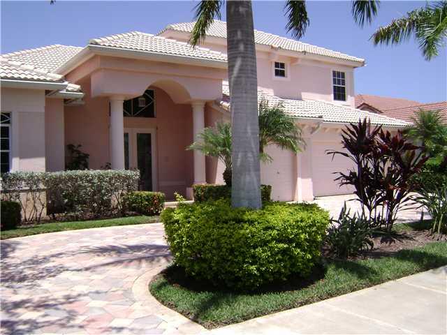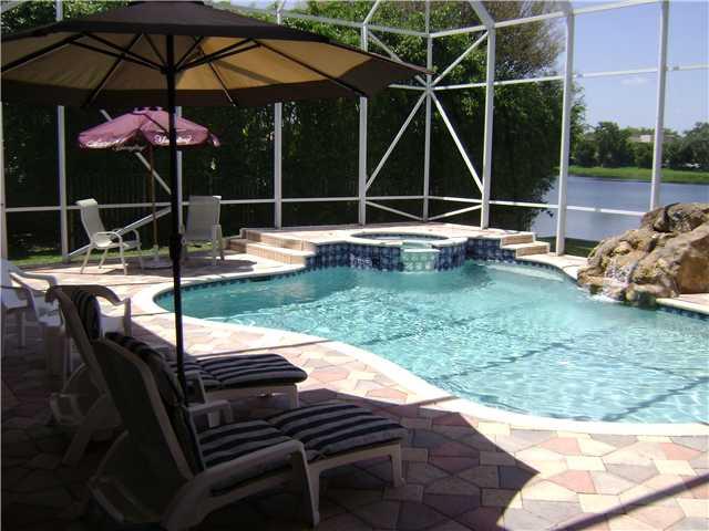Luxury waterfront estate home on golf cource. Home boasts a peaceful backyard,caged heated pool/spa with water fountain and balcony with lake views. The upgraded kitchen features granite counters, center island, wood cabinetry and wet bar. Tile floors and carpet in bedrooms. Master walk-in closet, 2 car & golf cart garage with a circle driveway. The community is gated with 24hr security guard. Low maint fee $187/m including cable,alarm,gate guard . This is a must see!
