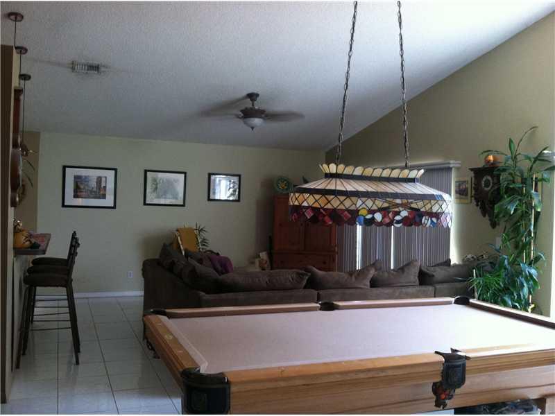 House in Silver Lakes the heart of West Miramar. One mile to Miramar Hospital and Regional Park with ball fields, track, Olympic pool and water park. Community pool, but plenty of space for a pool in back yard. Open living area with vaulted ceilings and s pacious kitchen. Split floor plan gives adults privacy in their lake front master suite with sitting area. Huge en-suite bath includes Jacuzzi tub. Monitored alarm system. Custom closet installations. Pool table with Tiffany light included.