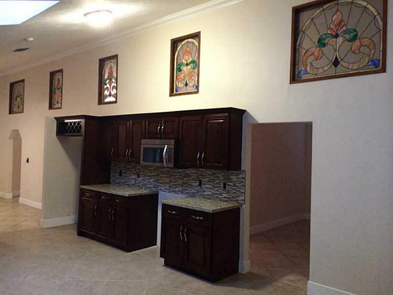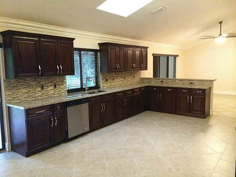 Beautifully remodeled ranch-style home in Davie. Vaulted ceilings in the living room, dining room and kitchen, which also has a large skylight for great natural light. Gorgeous stained glass windows between living and dining area and kitchen and family ro om give it a tasteful design feature not seen very often. Exquisitely remodeled kitchen and baths, large walk-in closets, huge garage and very inviting patio and pool area to enjoy with friends and family. Call today to schedule a walk-though.