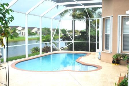 **APPROVED SHORT SALE AT $380K**"One Story house"..Enjoy the screened-in pool on this lakefront 4 bed/3 bath home. Large 2,552 SF floorplan with vaulted ceilings and endless upgrades. Blue pearl granite & SS appliances in Kitchen. Spectacular foyer with w all fountain, stone-tiled art shelf, marble floor and keystone columns. Gated community with tennis, basketball, pool, clubhouse, exercise, beach & more.