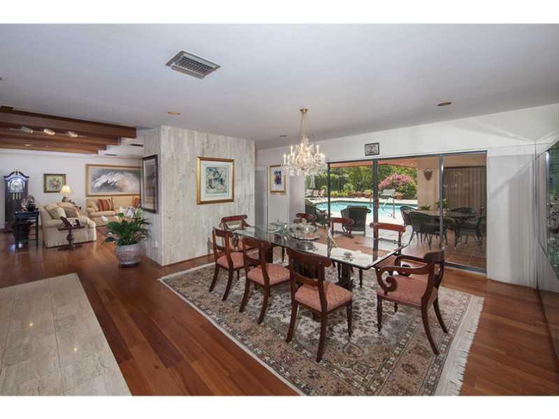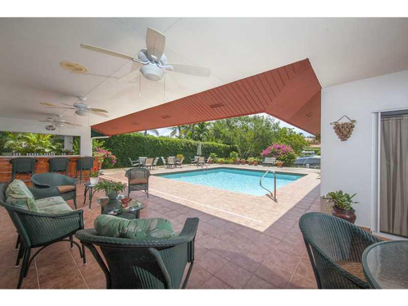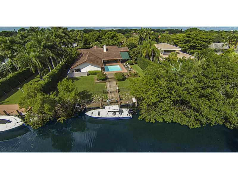 Waterfront 1 story house in Sec 1 on 27,908 sqft lot.Foyer w/marble floors. Living & dining w/wood floors overlooking pool & waterway.Left side of house has office,guest bedroom w/bath & cabana bath.Right side of the house has large updated kitchen w/gran ite,Monogram S/S appliances, island w/attached eat-in-table. 2+ bedrms w/baths & large master suite, bath w/2 sinks,tub & shower.Small patio off master suite.Large covered terrace, built-n-bar & wood deck.Pool, dock,electric davits and accordion shutters.
