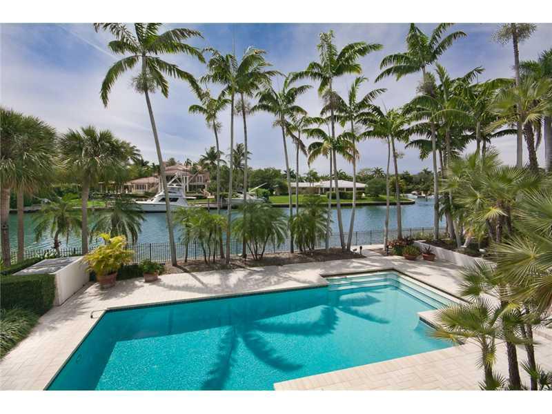 This beautiful contemporary-inspired home commands two water views. Centered on a lushly landscaped atrium this home is filled with natural light and boasts over 10,100 adj. sq. ft. Highlights include foyer entrance, formal living room w/ wood-burning fi replace and a magnificent library lined w/ floor-to-ceiling bookcases, stained glass ceiling and herringbone wood floors, gourmet kitchen, butler's pantry, spacious family room, elevator, impact windows & doors, 125KW generator, 3-car garage & heated pool