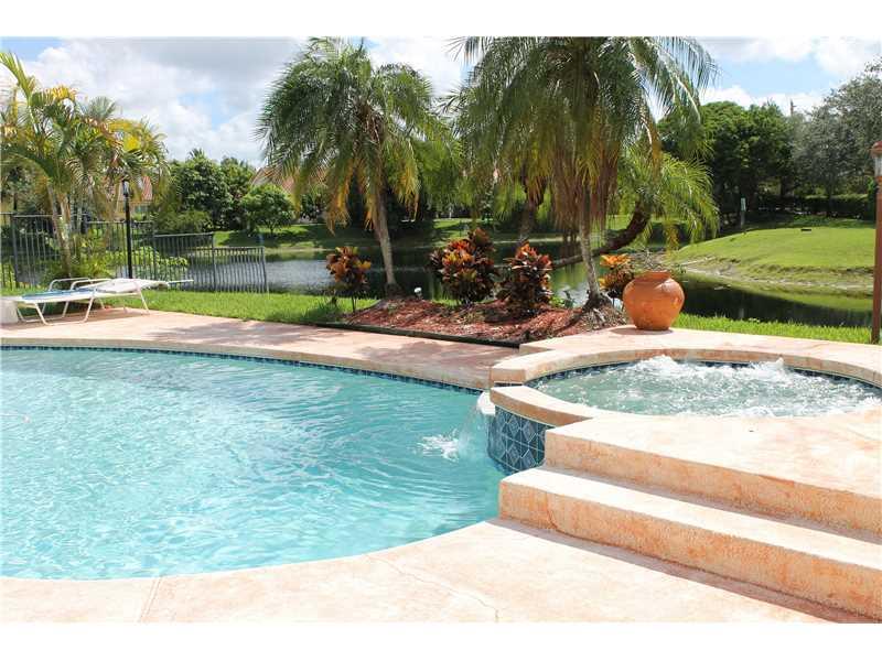 Vey bright one story house with a nice open floor plan great for entertainment and family gathering. Free form pool with a Jacuzzi. Very nice view of pool and lake from living room and master bedroom. Crown moldings in social area. Lots of closets. Separa ted laundry room with newer state of the art washer and dryer. Newer bathrooms. Laminated floor. Accordion shutters in all windows and sliding doors. Tiled garage for 2 cars. Pool vacuum not included.