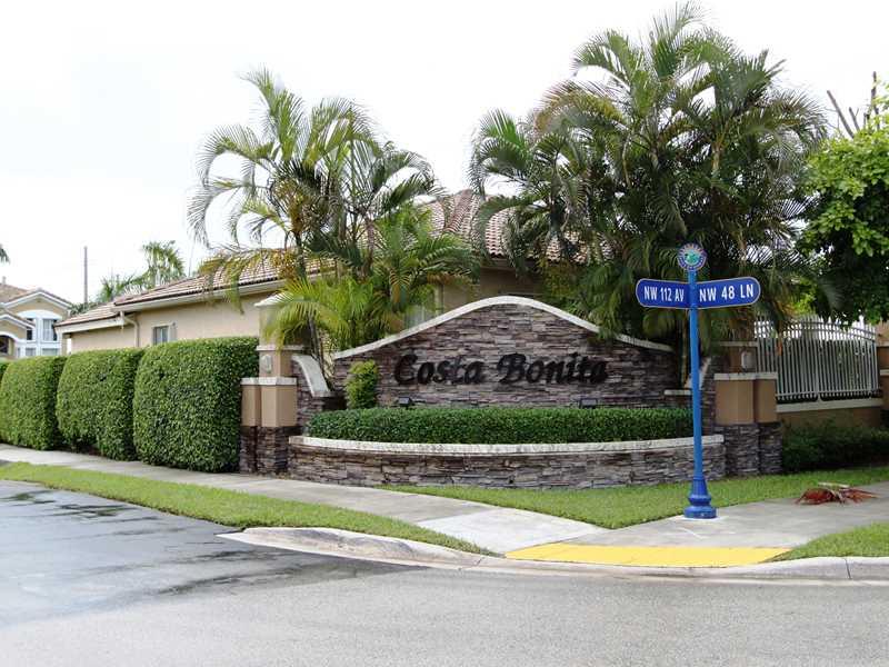 Just Reduced! 3 Bed/2 bath in gated, family friendly Costa Bonita, Doral. Open floor plan throughout. Master bedroom has 2 large closets and 5 piece bathroom. Large gourmet kitchen boasts large island, 42" custom soft close cabinetry, stainless steel ap pliances, quartz counters, custom pantry with pullout shelving. Marble tiles throughout main living area and bedrooms have updated laminate flooring. Beautifully tiled back patio. New AC-2011. 2-car garage, A+ Schools. Motivated Seller, Bring all offers