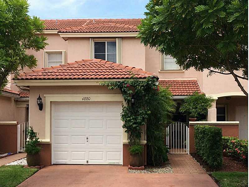 Impeccable, move-in ready townhome in gated community, steps to new park. Landscaped, tiled patio connects to bike path. Many upgrades: kitchen granite countertops, renovated 1/2 bath, laminate stairs, porcelain tiles in bedrooms and recessed lights. Mast er bath has roman tub, separate shower and vanity area. Is Alarm-ready, accordion shutters and lots of storage space, including 2 walk-in closets in mb and a patio closet. 1-car garage; 2-car driveway. Minutes from Dolphin Mall and MIA . Low HOA.