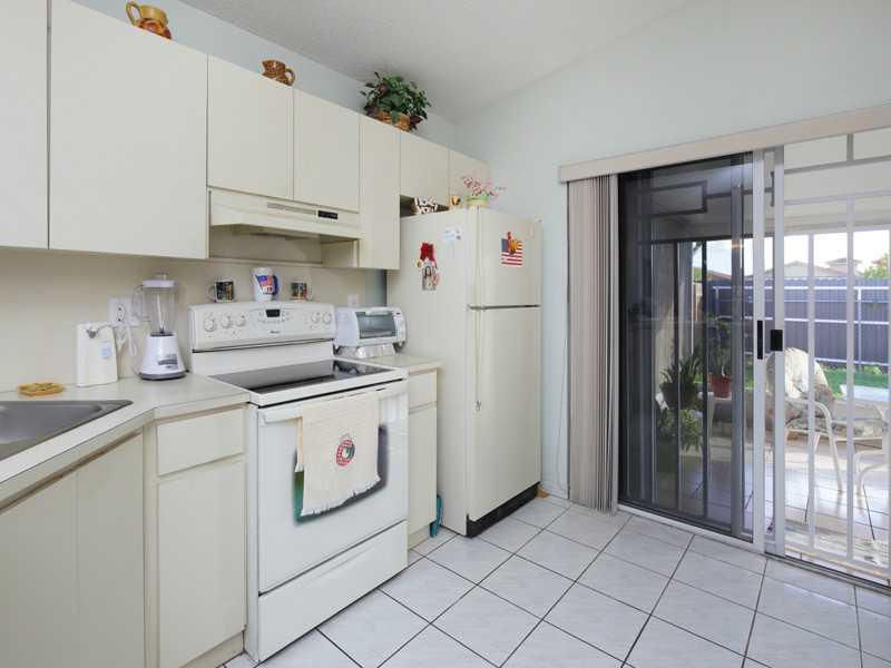 Beautiful one story townhouse, corner unit on dead end street with fenced back yard, covered screen patio, all tile, 3 parking spaces and accordion shutters on all windows. Located in west Hialeah.