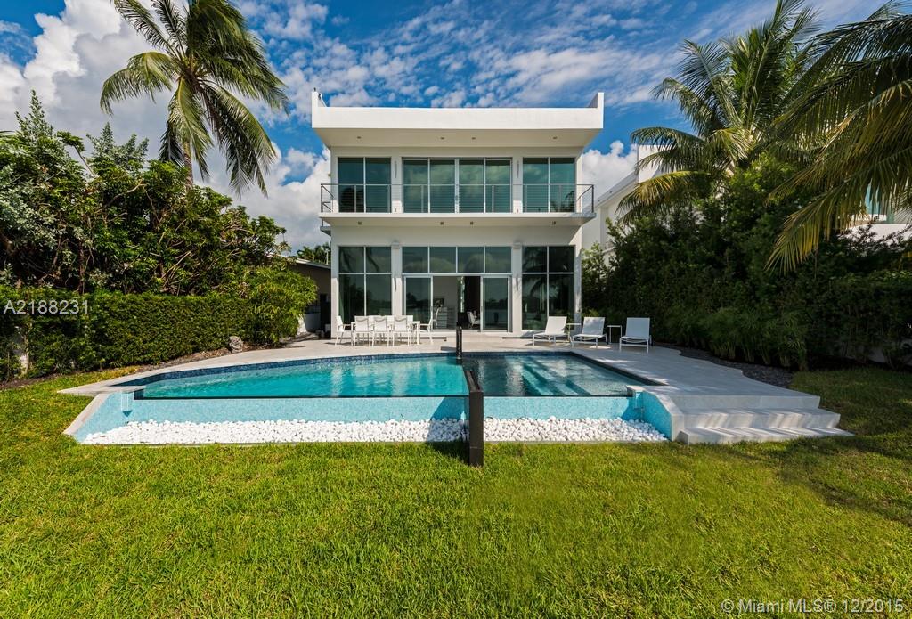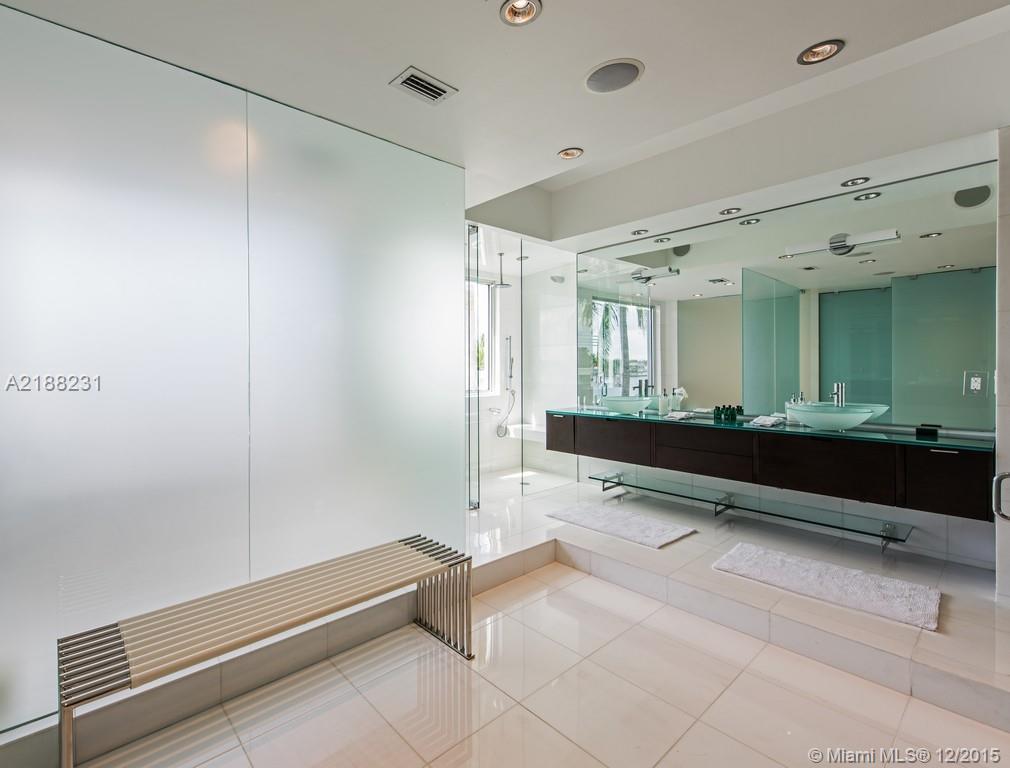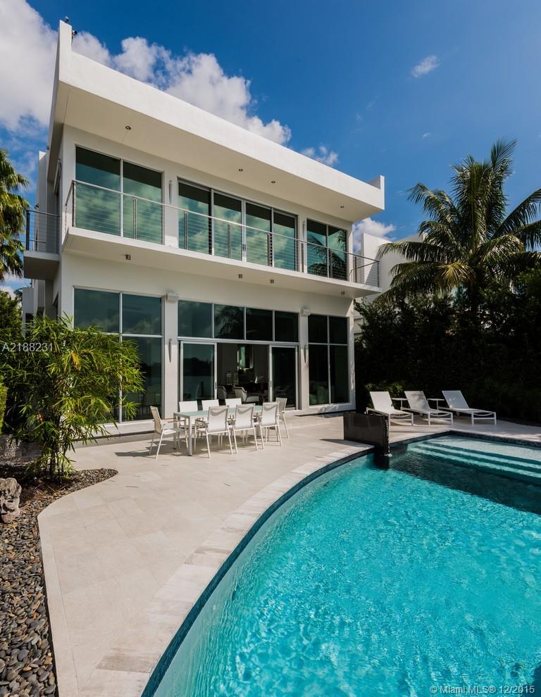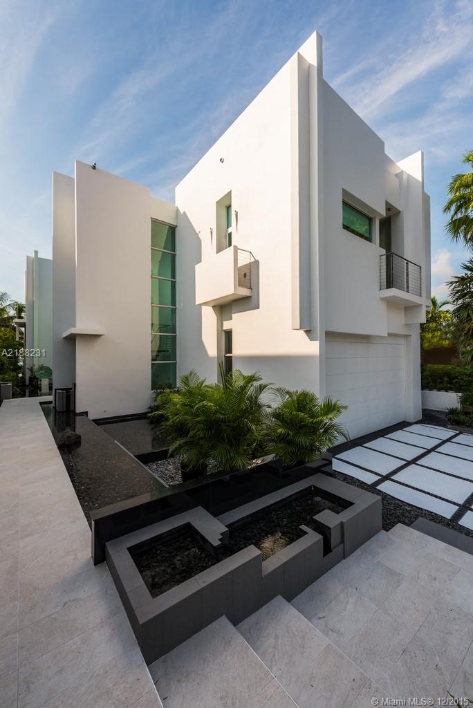 Serene Isle of Biscaya. Contemporary smart waterfront home, offers light filled living spaces surrounded by soaring glass walls & fountains, hovering over the wide bay, creating a sensory filled living environment. State of the art finishes and a great fl oor plan including, 5 bedrooms 5 baths upstairs, with a 1,200 s/f master suite. Dock, pool, 2 car garage plus room for lifts, 2 bedroom suites downstairs, eat in kitchen, family room, office, formal living and dining and more.