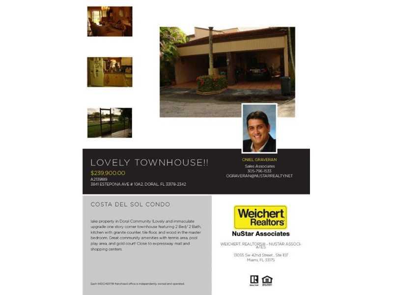 lake property in Doral Community !Lovely and immaculate upgrade one story corner townhouse featuring 2 Bed/ 2 Bath, kitchen with granite counter, tile floor, and wood in the master bedroom. Great community amenities with tennis area, pool play area, and g old court! Close to expressway mall and shopping centers.