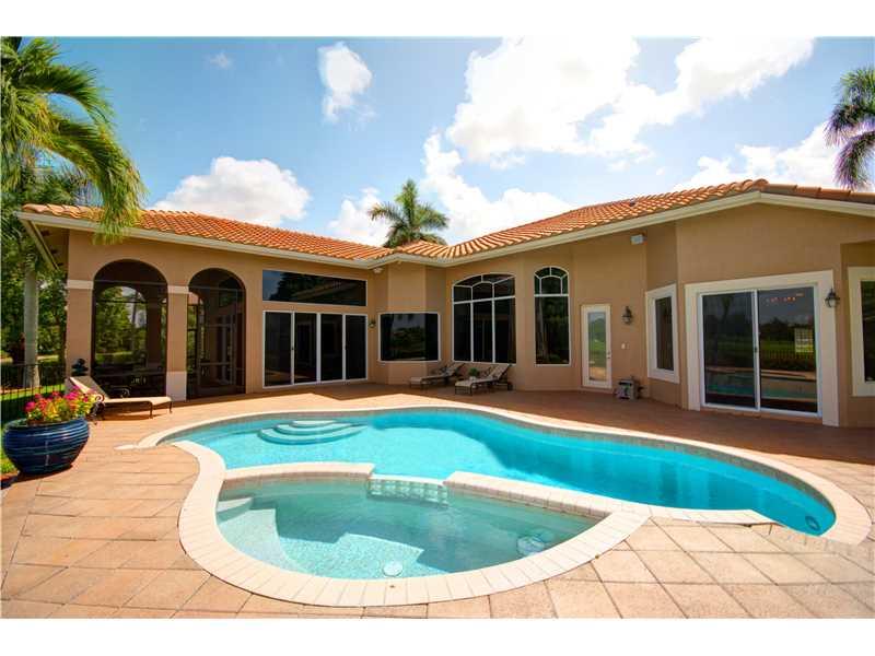 ABSOLUTELY STUNNING!! completely custom built pool home in the prestigious double gated community of The Falls at Heron Bay. Gorgeous lake and golf course view. Open and spacious triple split floor plan, saturnia marble floors, soaring ceilings with rich crown molding throughout. Gourmet kitchen with a gas Thermador cook top, sub zero fridge, in law suite, media room, spacious master with his and her closets, tropical pool with jacuzzi and much more. Bring your fussiest of buyers. Roof only 3 years old.