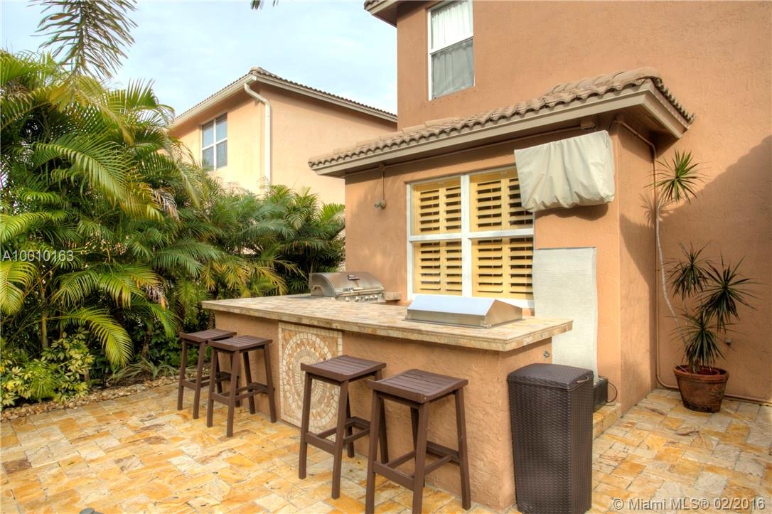 Beautiful home in the desirable Isles at Weston with a fabulous layout. Entertain beneath soaring in this resort style patio! A well-appointed kitchen with special design Bronze Jenn-Air, double ovens, microwave, dishwasher, refrigerator & hood. Quartz counter tops with glass tile backsplash that will take your breath away! Crown molding, ceramic tile 1st floor, wood floors in the stairs and 2nd floor. Don't wait a must see, act now before is gone!