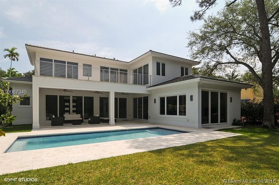 Built 2015- Dramatic 2 story classic contemporary in Prestigious Golden Triangle- Home exudes flair and style- High end finishes- 5BR suites, each w/own BA- High ceilings- All impact-Open plan- Lots of light- Magnificent kitchen,quartz counter,wolf & Miele appliances-Opens to large family room-2BR/2 1/2 BA,1st floor-Upstairs:Master+2 BR- Grand master suite,luxurious bath overlooks huge balcony- Elevator-Beautiful pool/patio area w/lots of privacy + summer kitchen-large covered patio ideal for entertaining