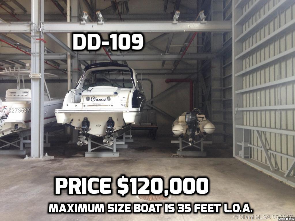 DRY DOCK 109 IS LOCATED ON THE GROUND FLOOR AT THE EXCLUSIVE SUNNY ISLES MARINA. IMPORTANT NOTE IS THAT GROUND FLOOR DRY DOCK SPACES HAVE THE HIGHEST CLEARANCE OF EACH OF THE 4 LEVELS INSIDE THE DOCKOMINIUM. MAXIMUM BOAT SIZE OVER-ALL LENGTH IS 35 FEET.