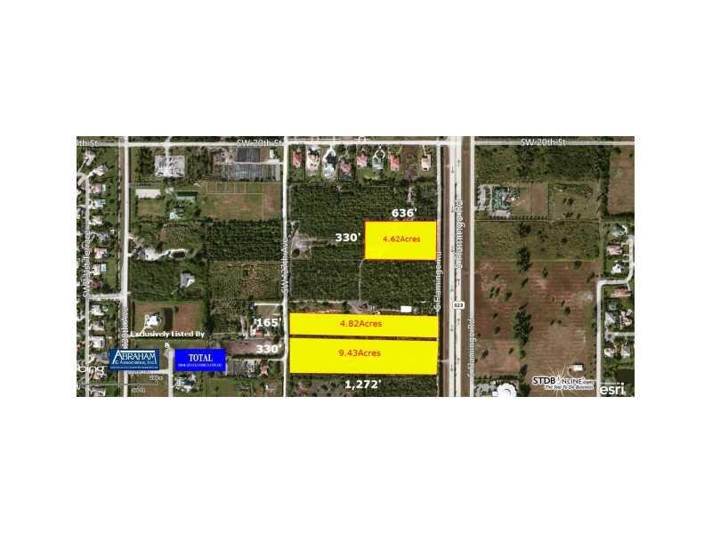 WOW! 9.43 +/- ACRES OF LAND FRONTAGE TO FLAMINGO ROAD SW 121 ST AVENUE, ZONED A-1 RESIDENTIAL ONE HOUSE PER ACRES. OPPORTUNITY TO LAND BANK OR PLAN FOR FUTURE RESIDENTIAL DEVELOPMENT. WALMART, GAS, CONVENIENCE STORES, AND OFFICES WITHIN ONE MILE AND SAWGR ASS MILLS MALL WITHIN FOUR MILES.SAWGRASS INTERNATIONAL CORPORATE PARK WITHIN FIVE MILES TO THE WEST, AND FLORIDA TURNPIKE SIX MILES TO THE EAST. I-95 AND FT. LAUDERDALE / HOLLYWOOD INTERNATIONAL AIRPORT 10 MILES.