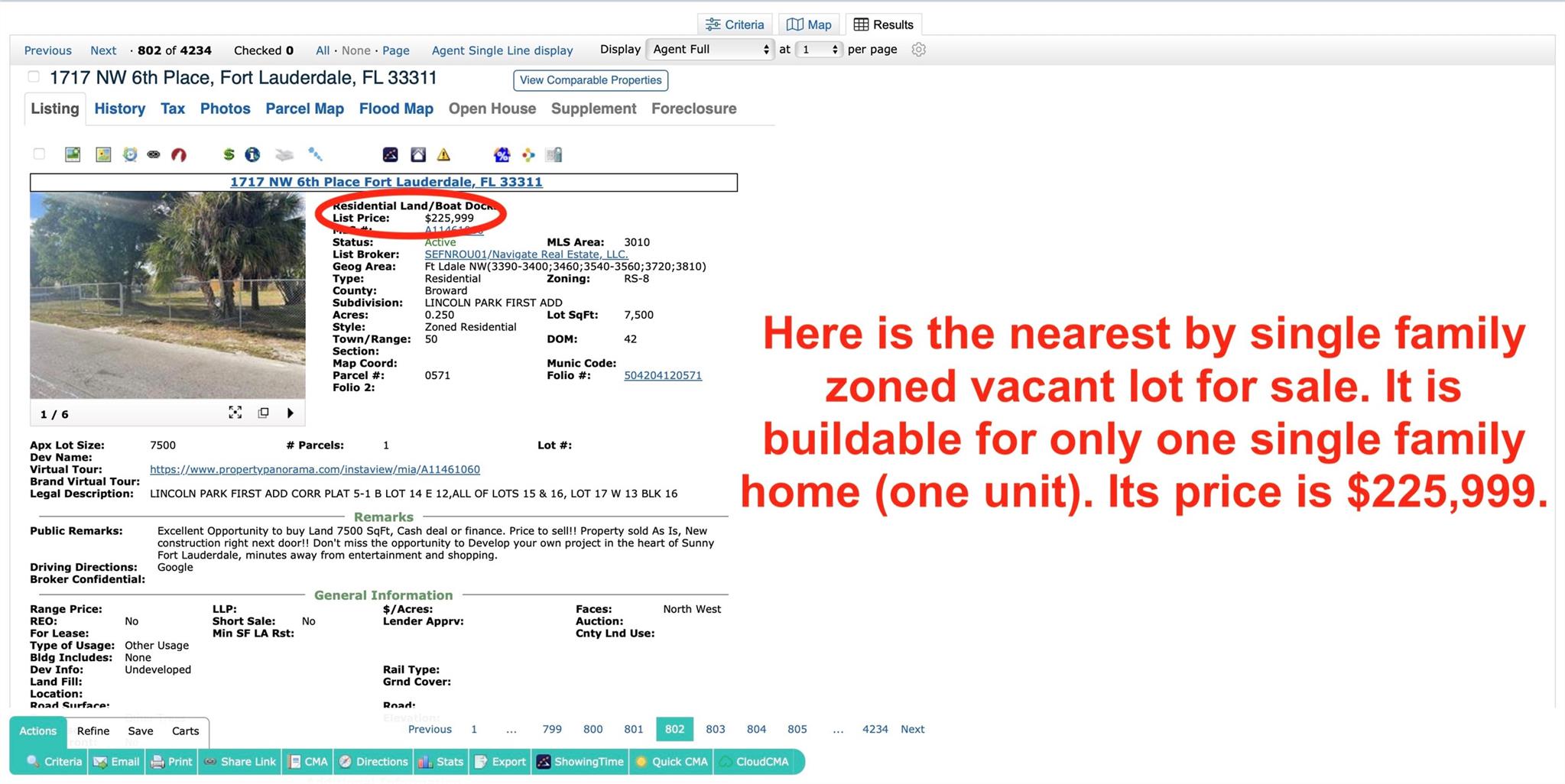 Rare opportunity on rapidly developing Sistrunk Blvd. Drive Sistrunk: see surge of construction. Opportunity zone. Huge tax benefits. Seller will finance. Potential CRA funding. Included sketch for 6 bed 6 bath building of residential units are in accordance with current zoning by right; no rezoning or variances required. Total construction cost $500k+/-. Monthly rent per unit based on comps $2,500. Gross annual income $90k+/-. All in cost $699k+/-. $1.25M+/- value once built based on 6%-7% cap rate. Active comps $145k-$225k per unit for land. OVER 50% OFF Market Value. See pics. Buyer has option to make building 3 stories with up to 2,500 sqft of commercial space on second floor. Commercial rent $25-$30/sqft per year. Great opportunity at a big discount. Call today.