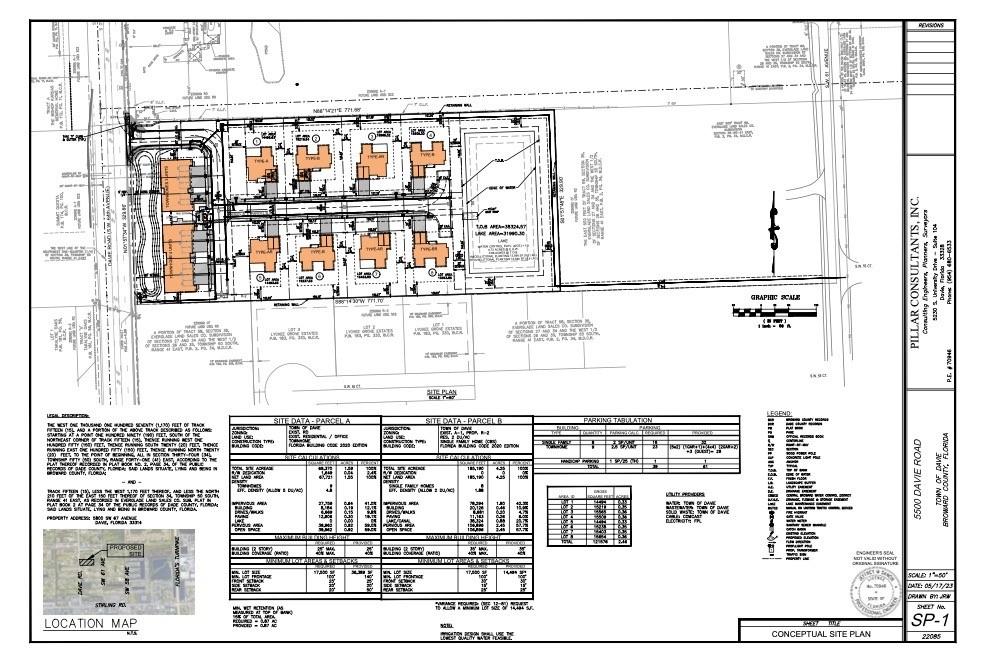 FULLY SITE PLAN APPROVED!!! Looking to develop without the hassle of entitlements? Your dream community awaits! This prime site in the heart of Davie is fully approved for 8 spacious 3,472 sq ft single-family homes with pools and 7 stylish townhomes with backyards up to 2,251 sq ft. Enjoy additional amenities like a dog park and a serene lake. Unlike many sites in Davie, this location is conveniently just about 20 minutes from the Fort Lauderdale city center, offering a perfect blend of space and entertainment in close by. Located just a couple miles from the South Florida Educational center including including Nova, Broward and FAU. Hollywood Hardrock Casino is only 2.1 miles away, offering a variety of attractions and nightlife. Fort Lauderdale International Airport just 8.3 miles away.