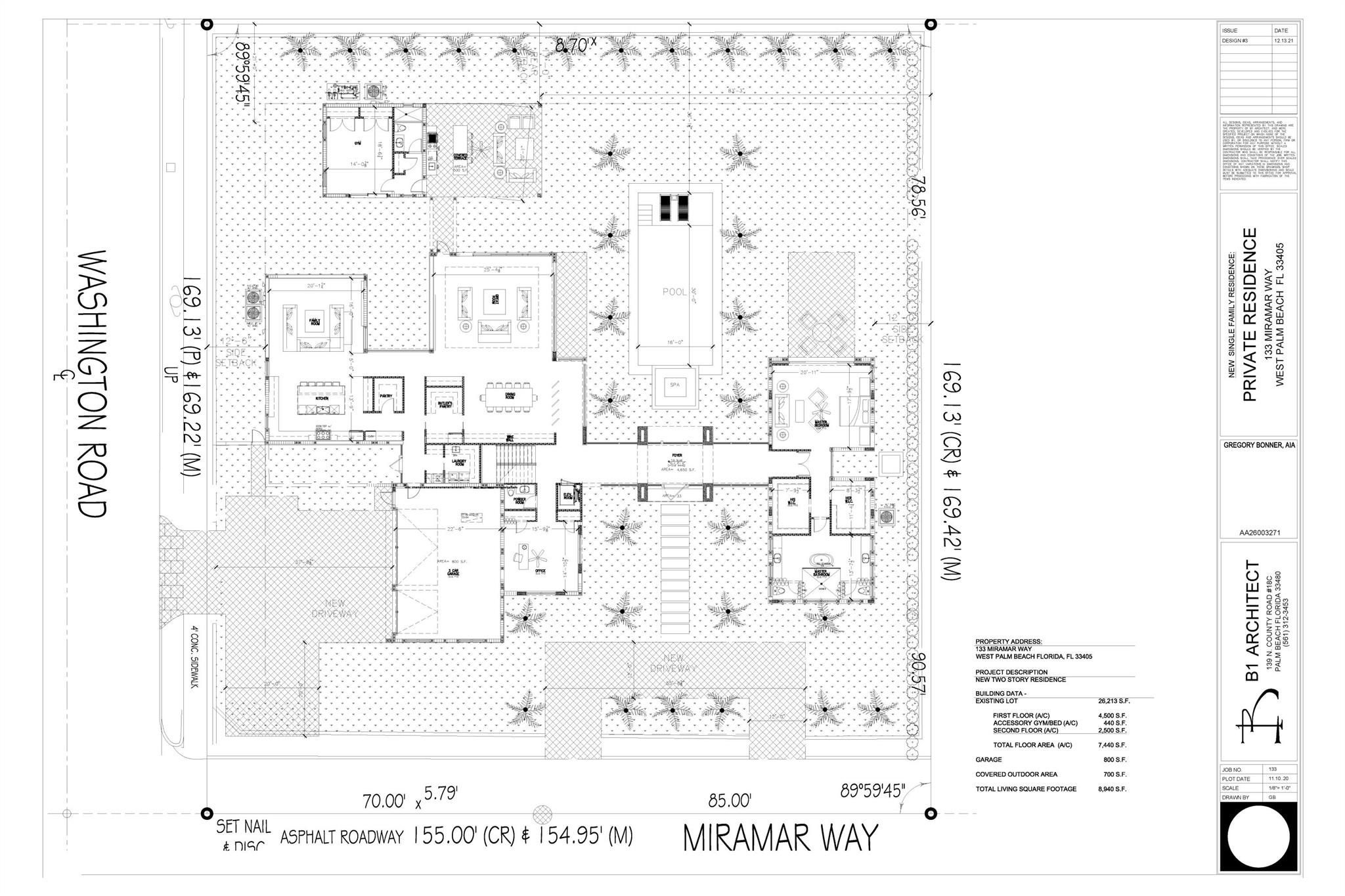 133 Miramar Way. A 26,148 SF lot. One of the largest single family homesites in coveted SoSo community of West Palm Beach. Situated on the corner of Washington Rd & Miramar Way, the lot is on a quiet tree-lined cul-de-sac with a deeded right-of-way for Miramar residents to access the South Flagler Promenade. The property has been cleared & is surrounded by a privacy wall that was saved due to the $200,000 value to replicate today. Designed by Greg Boner of b1Architecture, the purchase comes with spectacular plans for a contemporary home with 7,440 Living space & 8,940 Total SF, leaving ample room for a yard & gardens. The house features 2 primary bedrooms, 3 additional bedrooms, an office, a gym, 3-car garage and a 700 SF outdoor loggia with a summer kitchen. Don't miss this opportunity!