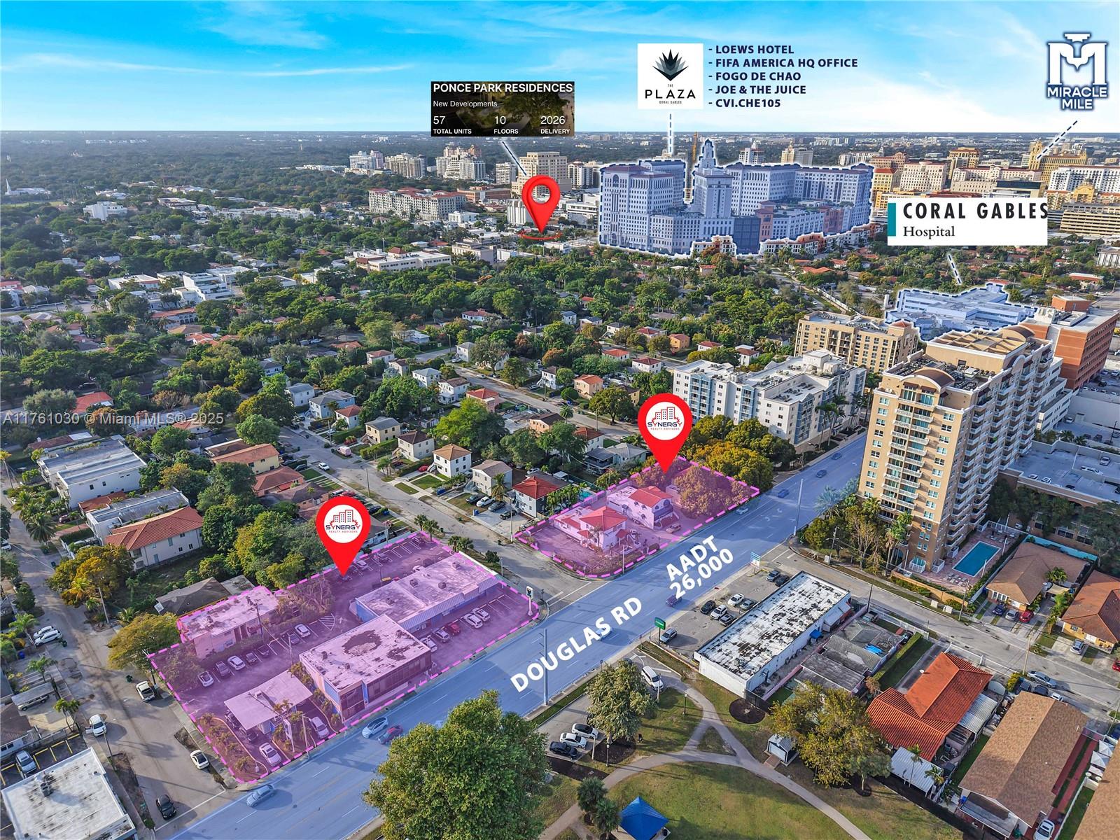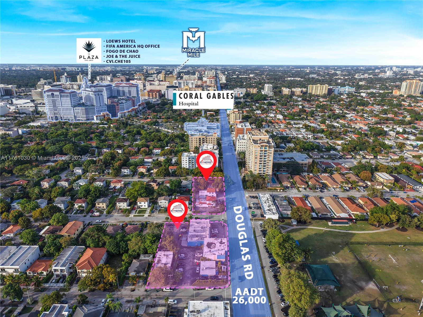 Two-block assemblage totaling 1.26 acres at the edge of Coral Gables for sale, directly across from the to-be-renovated Douglas Park and near Coral Gables Hospital. The site consists of 1.14 acres zoned T6-8-O and a 0.12 acre T3-O lot, allowing 172 units by right, with potential for additional height and density through workforce housing incentives. Located half a mile from the Link at Douglas development. Current uses include a specialty medical center (owner-occupied), a multifamily generating $12,000/month, and three mixed-use buildings producing $18,000/month. Seller may lease back the medical center, bringing projected monthly income to $50,000. Rezoning the T3-O lot could unlock additional development flexibility, including Live Local Act opportunities. Seller financing available.
