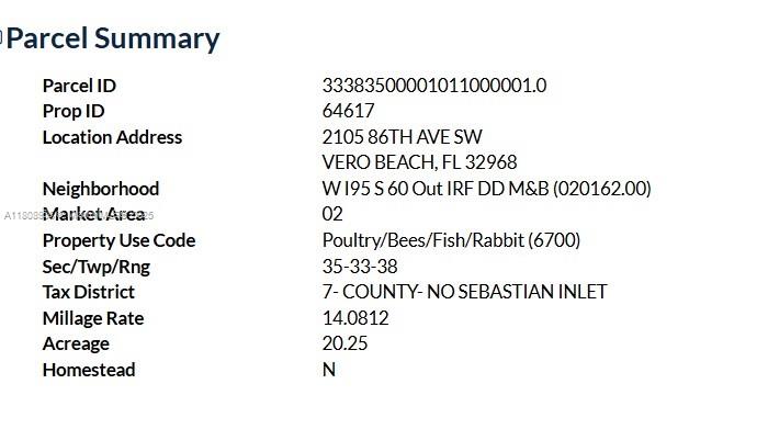 Welcome to your dream homestead or business haven in sunny West Vero Beach, Florida right off the brand new-coming soon I-95/Oslo Exchange for unbeatable access. This 20.25± acre ranch is fully fenced, privacy, and versatility. Property Highlights: 2 Massive Total 7,620 sq ft Structure 16’ ceilings, Office space included, Expansive storage for micro-green/hydroponics or convert to a luxurious barn event. Agricultural Zoned A-2 Apiary/Cattle operations. All Equipment incl. Ideal for: Homesteaders & Preppers, Rancheros & Livestock Enthusiasts, Event Venue Creators, Agribusiness Entrepreneurs, Visionaries with big dreams and love for the land, Location, Location, Location: Set in the rapidly developing West Vero Beach corridor, this property is a golden investment in both land and lifestyle