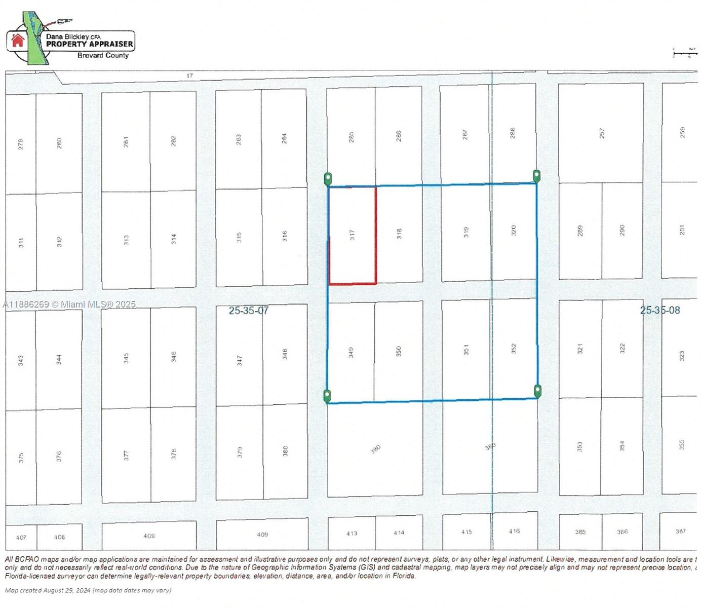 Investment Opportunity – 8 Residential Parcels in Brevard County! Looking for a prime piece of Florida land? This package includes 8 adjoining parcels in Brevard County, zoned GU (General Use) and designated 0010 – Vacant Residential Land (Single Family, Platted). Each parcel is approximately 1.25 acres (±54,450 sq ft), offering plenty of space and future potential. With no current road access, this land presents a rare opportunity for savvy investors or future development as the area grows. All eight parcels are being sold together. Brevard County Account Numbers: 2500349, 2500350, 2500351, 2500352, 2500365, 2500366, 2500367, 2500368 Seize the chance to secure your piece of Brevard County today!