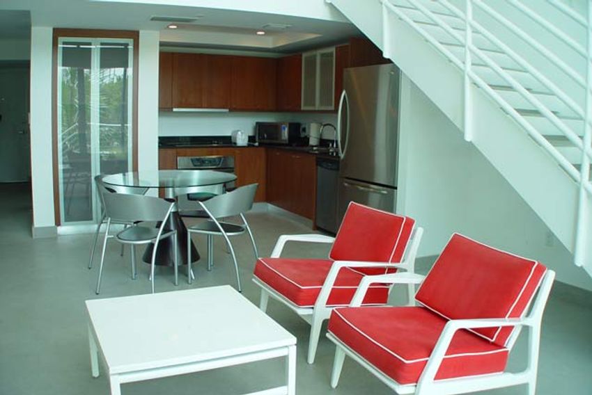 Condos in South Beach, Florida offer 20, two-story apartments, each with 18-foot ceilings. Penthouse units have a private rooftop area. Colossal grey limestone throughout the first floor and stairs, thick wood floor upstairs. Kitchen cabinetry with solid Italian wood doors and frosted glass, stainless steel appliances, granite counter tops. The Lofts have a master suite in the upper floor with a large custom made walk-in closet, splendid black slate/white marble designer bathroom with fixtures and giant dual shower heads.