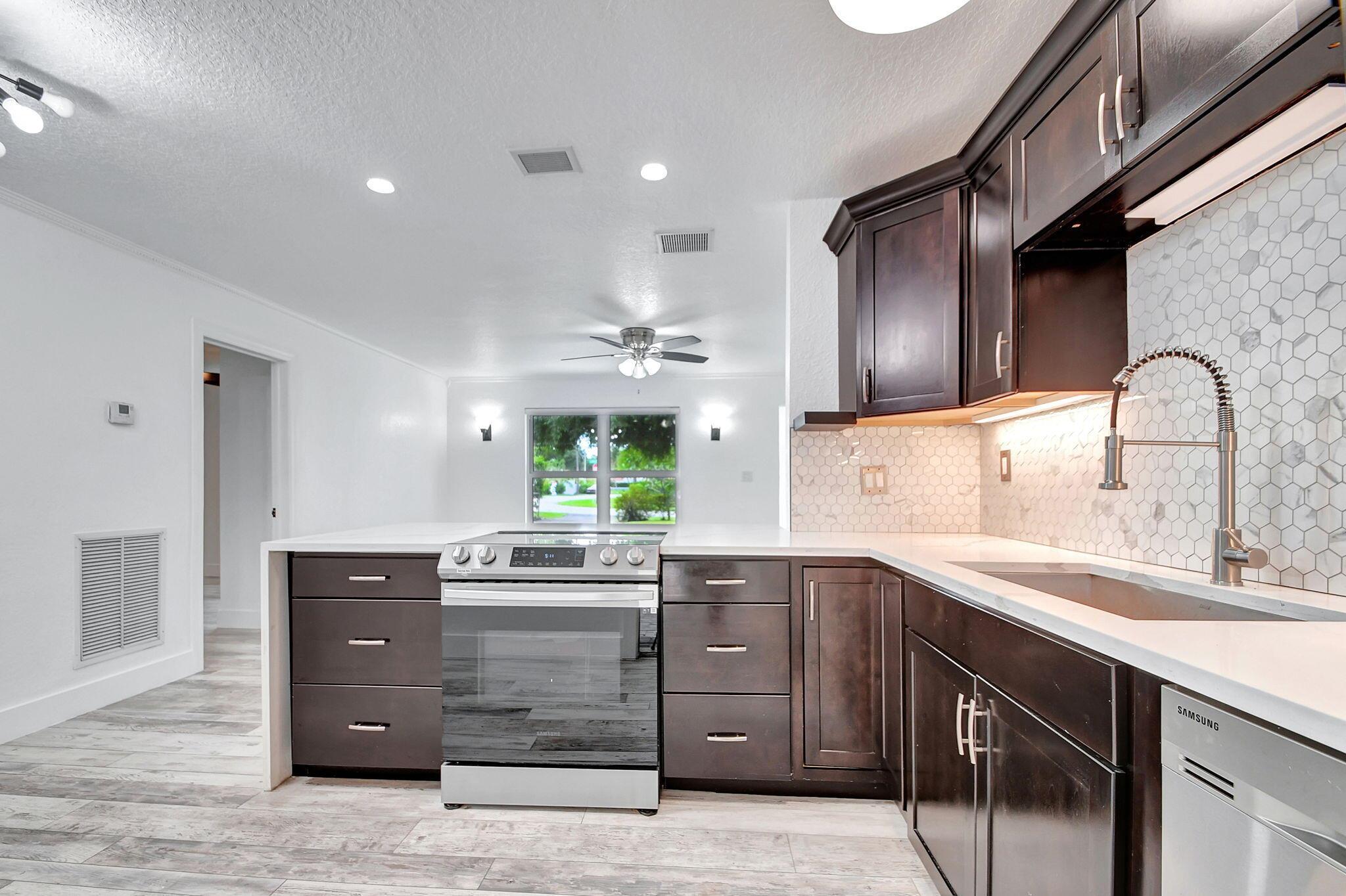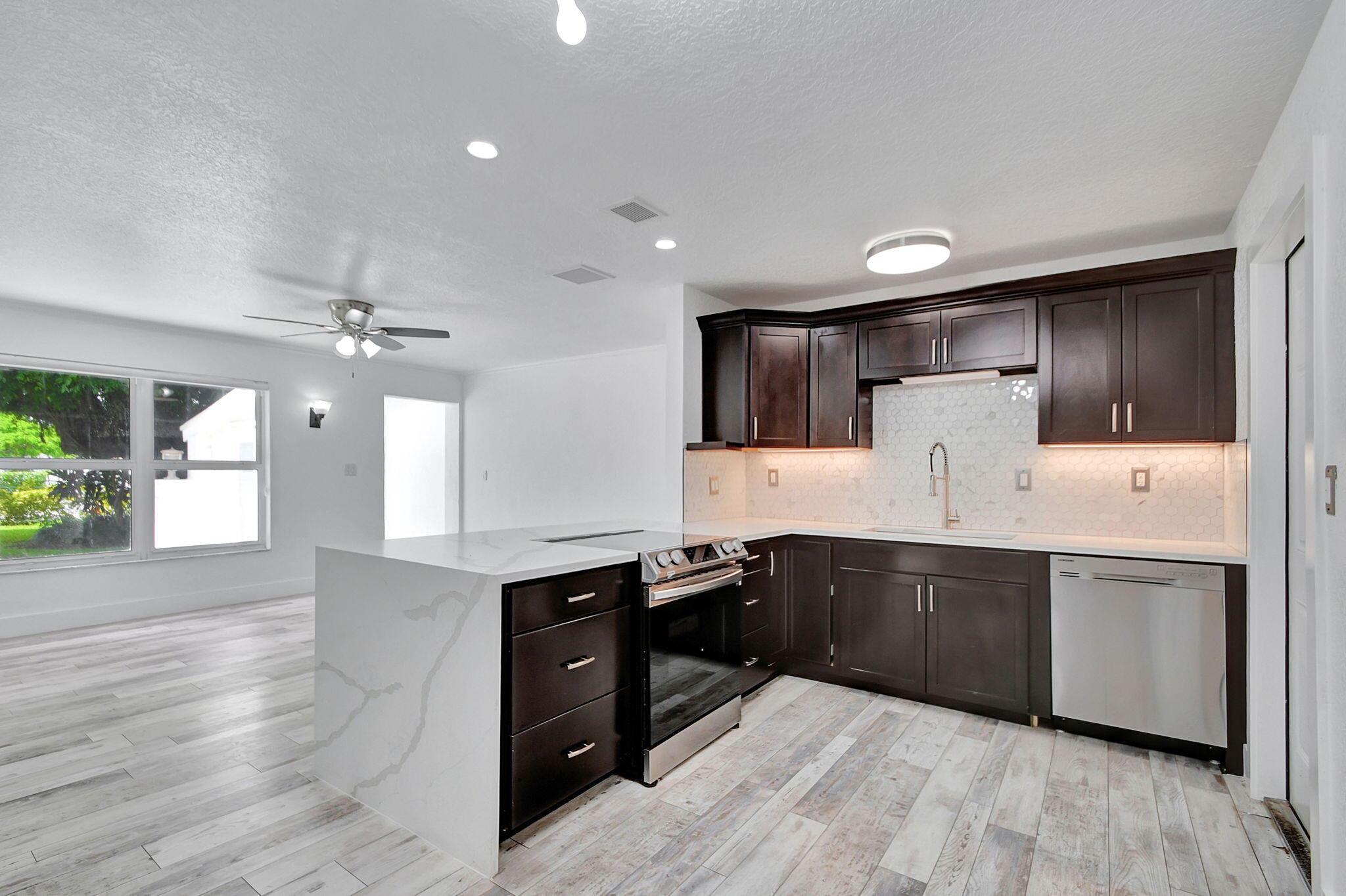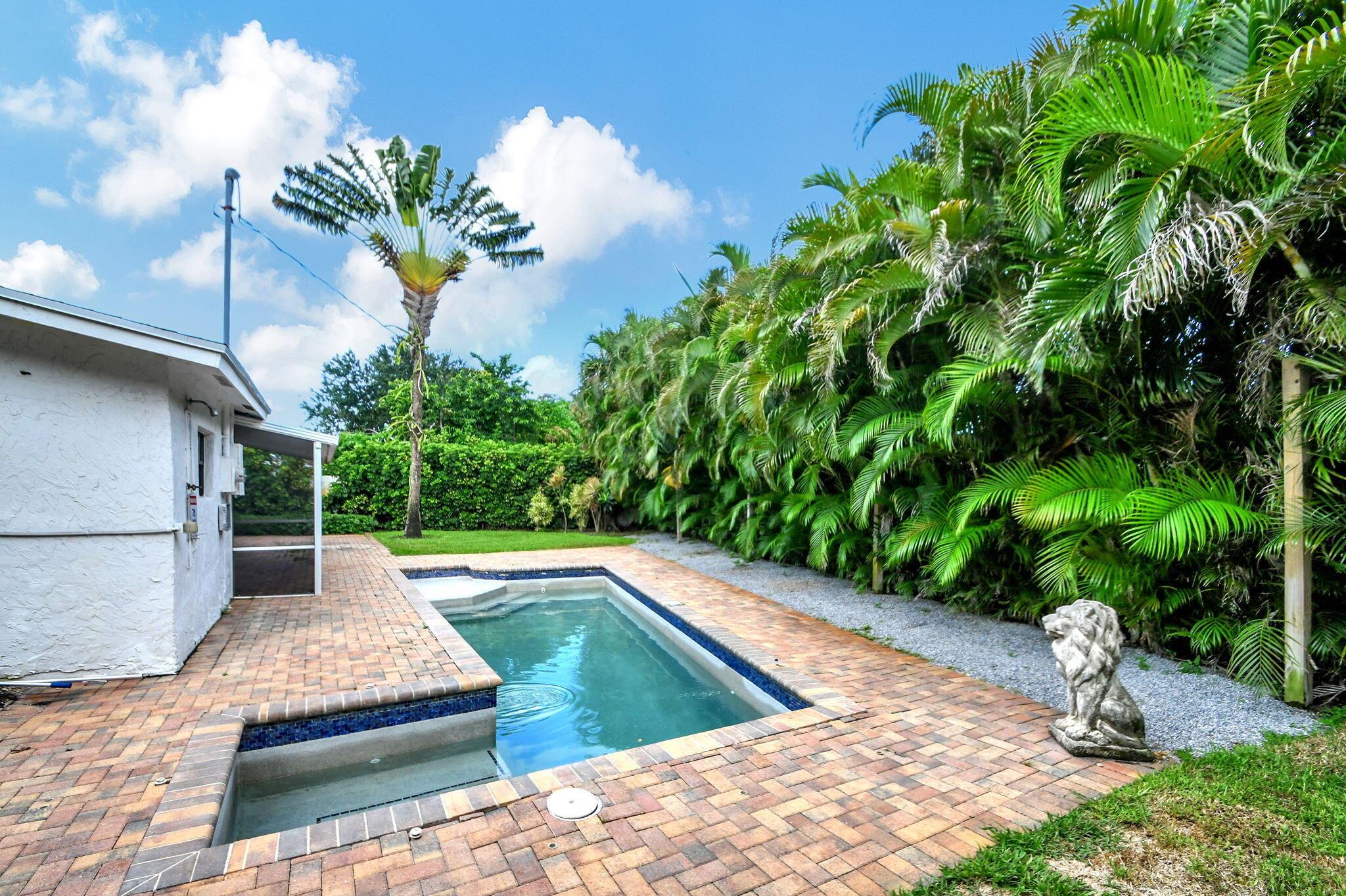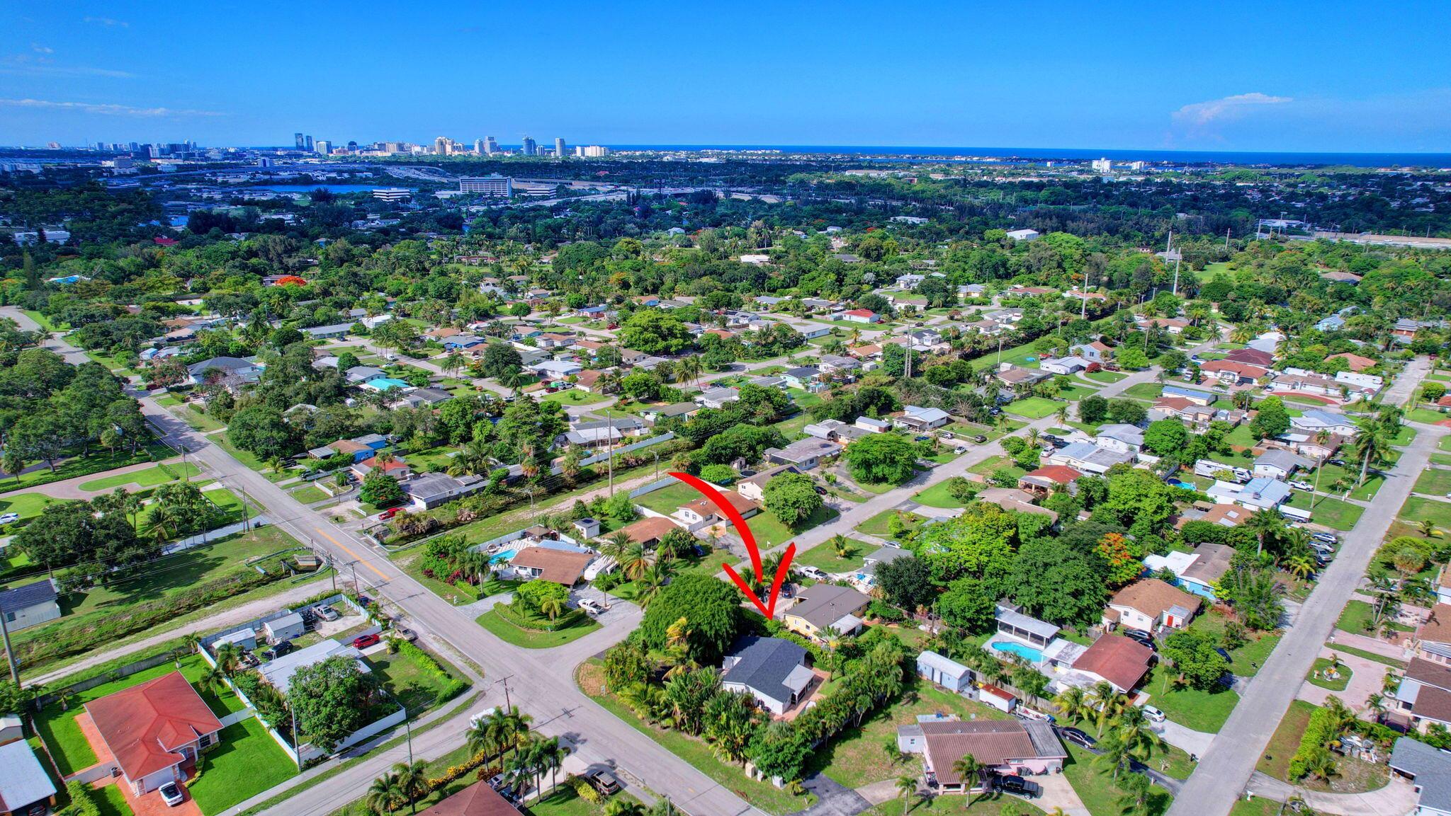 Located minutes to Downtown West Palm Beach, This Turnkey Home is Ideally positioned on an Expansive Corner Lot adorned with mature landscaping and spacious 180-degree driveway. Step inside to find an inviting open-concept layout seamlessly connecting the kitchen, dining, and family room areas. The kitchen is adorned with Calcutta Quartz Countertops and Modern Appliances, creating an ideal setting for culinary creations and gatherings. This thoughtfully designed home boasts a Split-Bedroom floor-plan featuring two en-suites alongside an additional bedroom and bathroom. Outside, a screened-in patio offers a tranquil retreat overlooking the expansive backyard, complete with a sizable pool, lush green spaces, and an outdoor showera''an entertainer's dream.Recent updates include a new