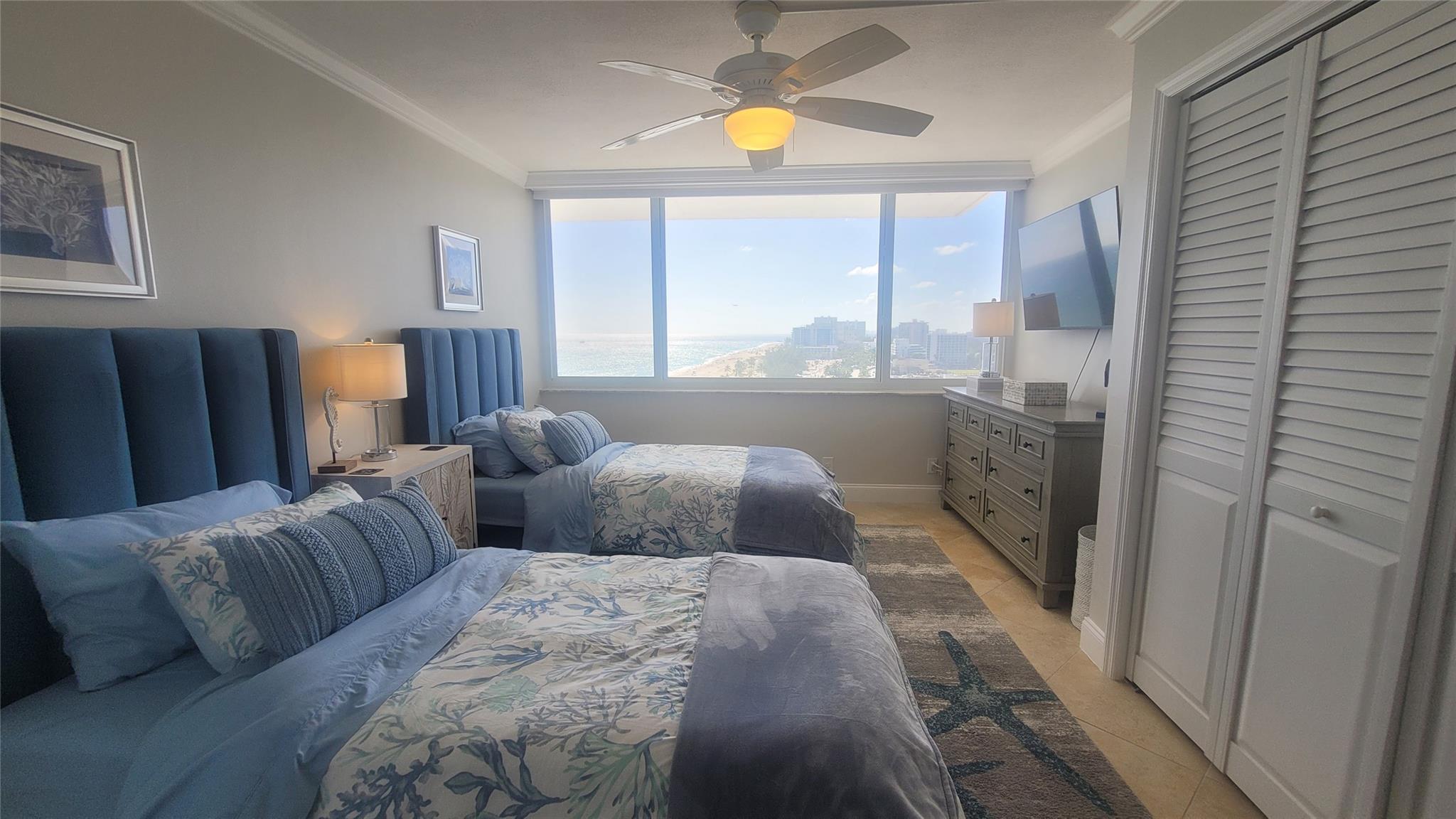 A rare find in one of the most desirable locations on Ft Lauderdale Beach. This fully equipped furnished 2/2 condo sleeps 4 and has panoramic views of the beach, Intracoastal, marina & downtown city lights. The unit has a large master bedroom with a king-size bed, desk & ensuite bath. The guest bedroom features 2 twin beds. A large open floor plan with family room, kitchen & dining area make this a great space to entertain. Flat screen smart TVs in every room as well as free wi-fi access and all utilities are included. There is a private balcony, in-unit washer/dryer and one garaged parking space. A heated community pool is available for use as well as a large community room. 2 month minimum stay required. Rates subject to term dates and availability.