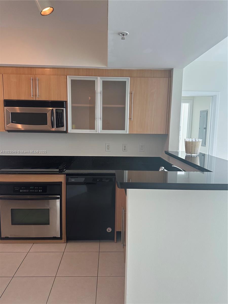 Only unit with 2 parking spaces included at no extra charge. Blackout window treatments in all three bedrooms and motorized window treatments for all sliding glass doors. Glass encased shower/bathtub,and a standout feature of an extendable lighted makeup/shaving mirror with 3 light settings mirror in both bathroom. This 3-bed, 2-bath unit has gorgeous unobstructed views of Biscayne Bay and Miami River. Its Italian kitchen features black granite countertops and comes with an electric stove, refrigerator, microwave, dishwasher, garbage disposal, washer and dryer.You will have access to 2 gyms, 2 pools and jacuzzi, sauna room, 2 party rooms, children’s play room, and onsite café.The building boasts a 24-hour concierge service and a state-of-the-art security system. Ready to move in!