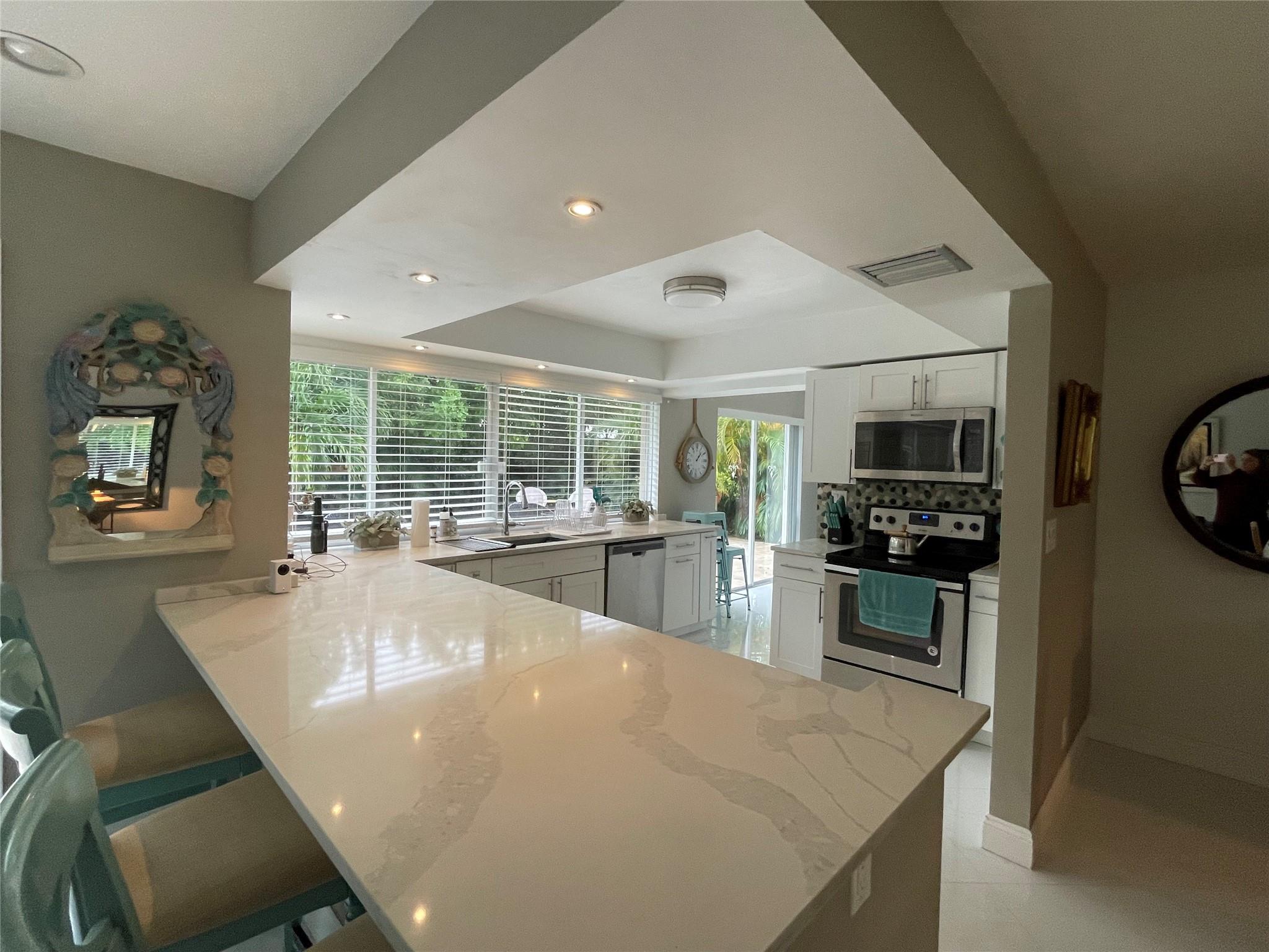 This beautifully renovated, turnkey 4-bedroom, 3-bathroom pool home is located in the highly sought-after Imperial Point neighborhood. The updated kitchen features elegant quartz countertops, updated bathrooms and tile throughout. Abundant windows allow for plenty of natural light to fill the space. You can enjoy relaxing by the pool, which includes a pass-through window from the kitchen, a spacious patio area, and a fenced-in backyard for added privacy. This home is conveniently situated near beaches, restaurants, shopping, and golf courses, as well as popular destinations like Fort Lauderdale Beach, Lauderdale-by-the-Sea, and Downtown Fort Lauderdale. The property is fully furnished and ready for you to move in. Available for annual lease or short-term minimum 2 months.