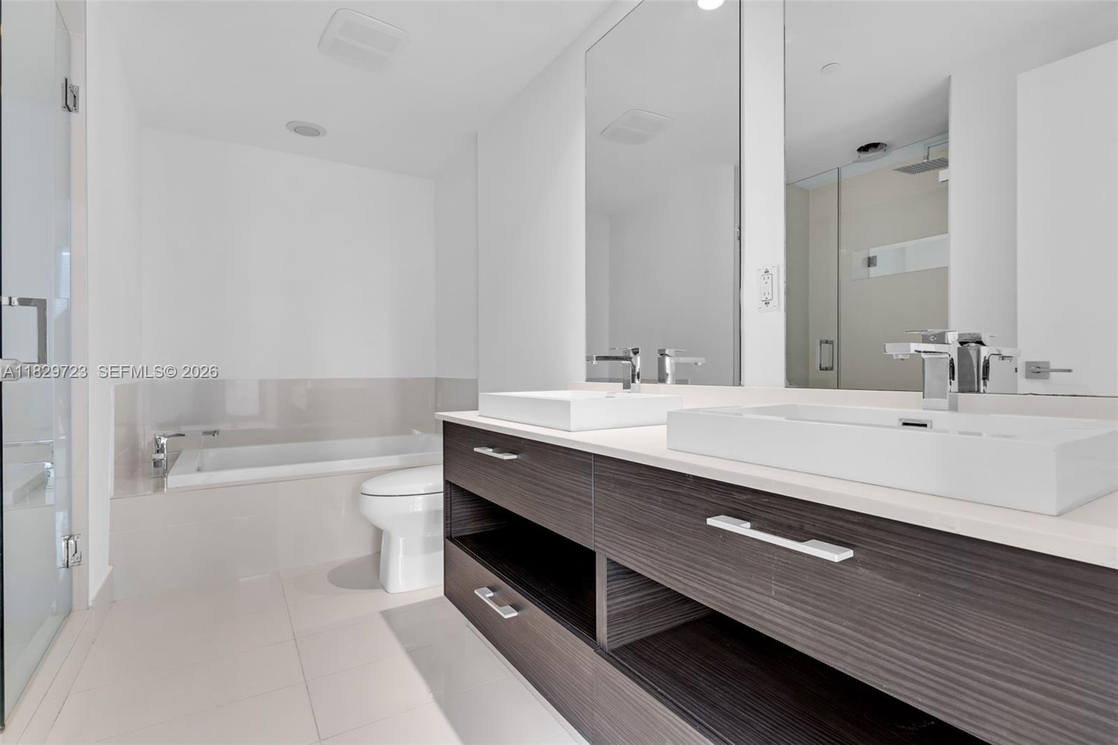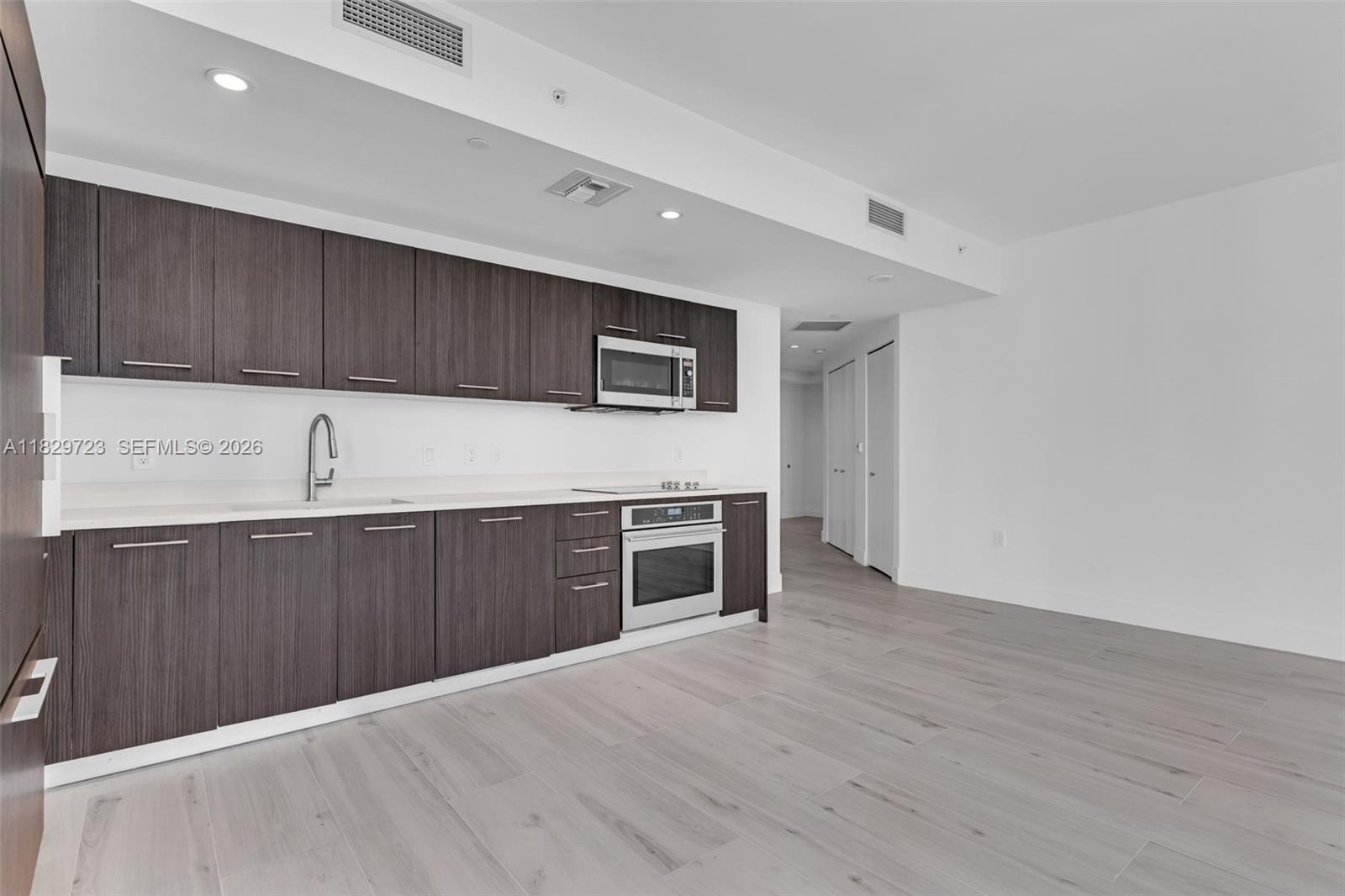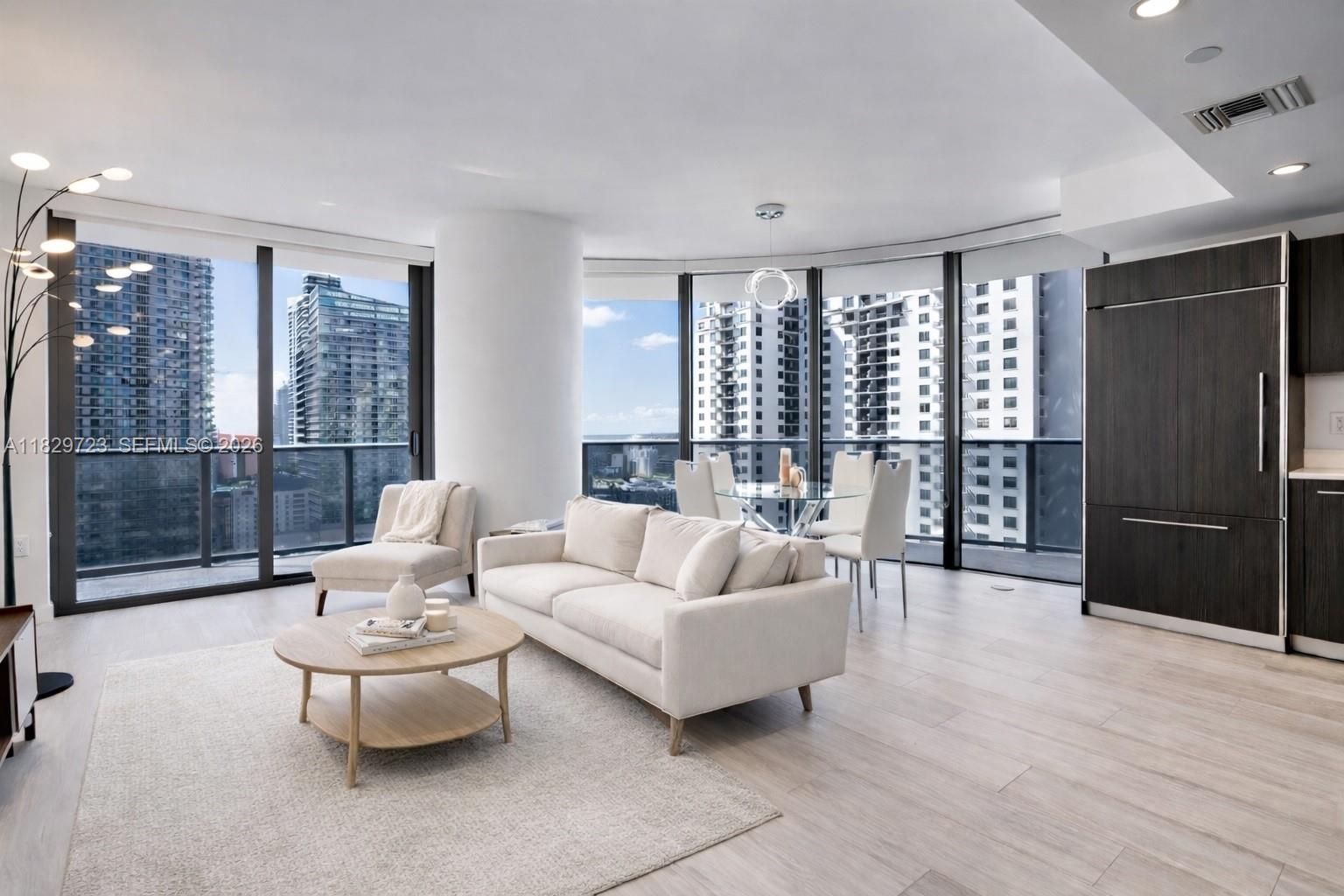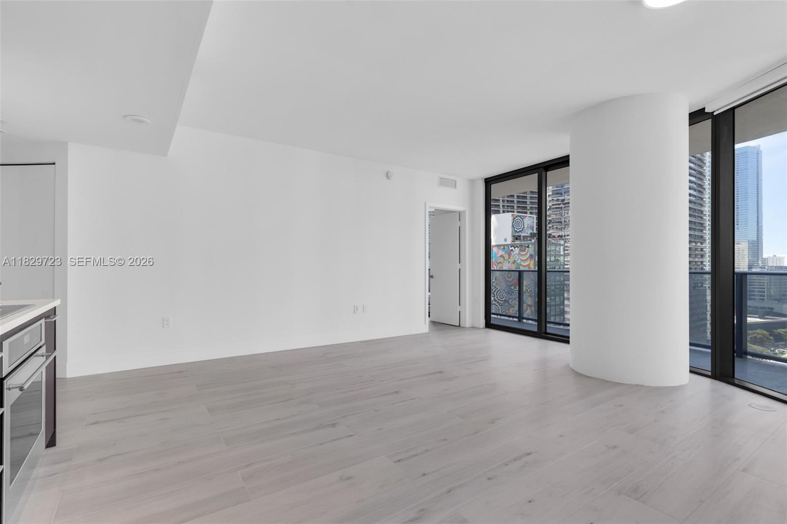 Spacious 2BD+Den in the heart of Brickell. Unfurnished unit with stunning skyline and bay views from wraparound balcony and floor-to-ceiling windows. Newly installed white wood-look tile flooring and freshly painted. Features European kitchen with stone countertops, stainless steel appliances, blackout bedroom shades, washer/dryer, and great closet space. Luxury building with resort-style amenities including rooftop pools, spa, theater and more.