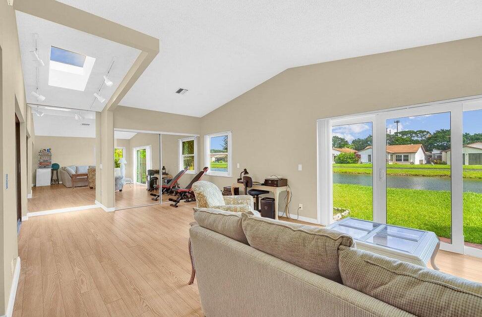 Welcome Home to Mirror Lakes, Lakefront Living at Its Finest! This stunning 2-bd, 2-ba 1-cg home offers serene lakefront views & modern upgrades throughout. The heart of this home is the beautifully renovated kitchen, featuring white panel cabinetry, granite countertops, tile backsplash, & updated appliances. Both bathrooms have been beautifully renovated. New luxury vinyl flooring in both bedrooms.The home is equipped with hurricane impact windows & sliding doors for peace of mind. The family/flex room overlooks the lake, offering the perfect space for relaxation or entertaining. Additional highlights include 18'' tile, high-hat lighting, A/C & water heater (2020). A seamless blend of indoor & outdoor living with an open lanai, a screened & covered patio.